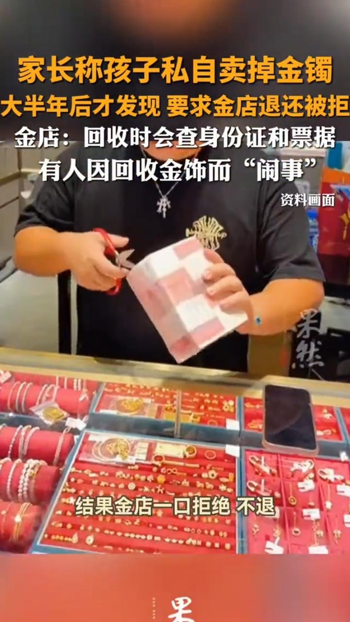 “离了个大谱!”1月31日,陕西咸阳泾阳县,一位家长发现未满16岁的孩子,把家里20多克的金镯偷偷卖了,只卖了1.7万元,现在金价涨了想退钱要回金镯,金店却直接拒绝!网友:大多都站店家这边! 金店回收金饰是常见生意,大家都觉得得仔细核实身份和来源,按规矩办事就行,下面这位家长遇到的事,让不少网友都觉得店家没毛病。 2025年4月,孩子没跟家里人商量,就私自拿走了长辈的金镯,跑到泾阳金店卖了,当时店方按规矩给了1.7万元,直到2026年1月,家长整理东西时才发现金镯不见了,追问之后才知道孩子把它卖了。 后来家长听说金价涨了不少,这只20多克的金镯市值都快3万元了,就赶紧找金店沟通,说愿意把1.7万元退回去,只求拿回金镯,可金店说回收时看了身份证、流程合规,坚决不同意,说没法退还原物。 这让家长又急又气,双方在金店门口吵得不可开交,动静大到警车和120救护车都来了,家长见协商不成,直接报了警,还向泾阳县市场监管局投诉了,目前相关部门正在调查。 网友看后大部分都站店家,说金店回收按规矩来,半年后金价涨了才来要回,这也太不合理了,家长自己没看好孩子和财物,现在反倒怪店家,实在说不过去! 信息来源:《孩子私卖长辈金镯被金店1.7万元回收,家长半年后发现要求退还遭拒绝,市监局和警方介入调查》极目新闻