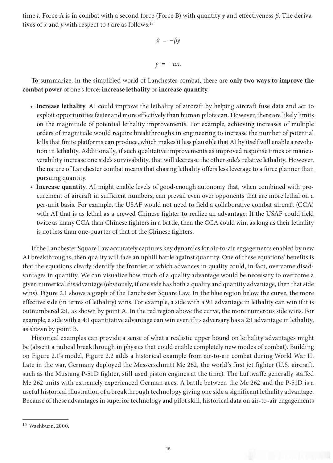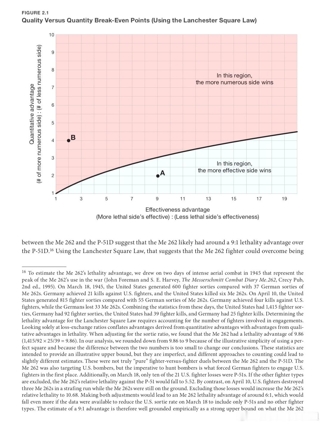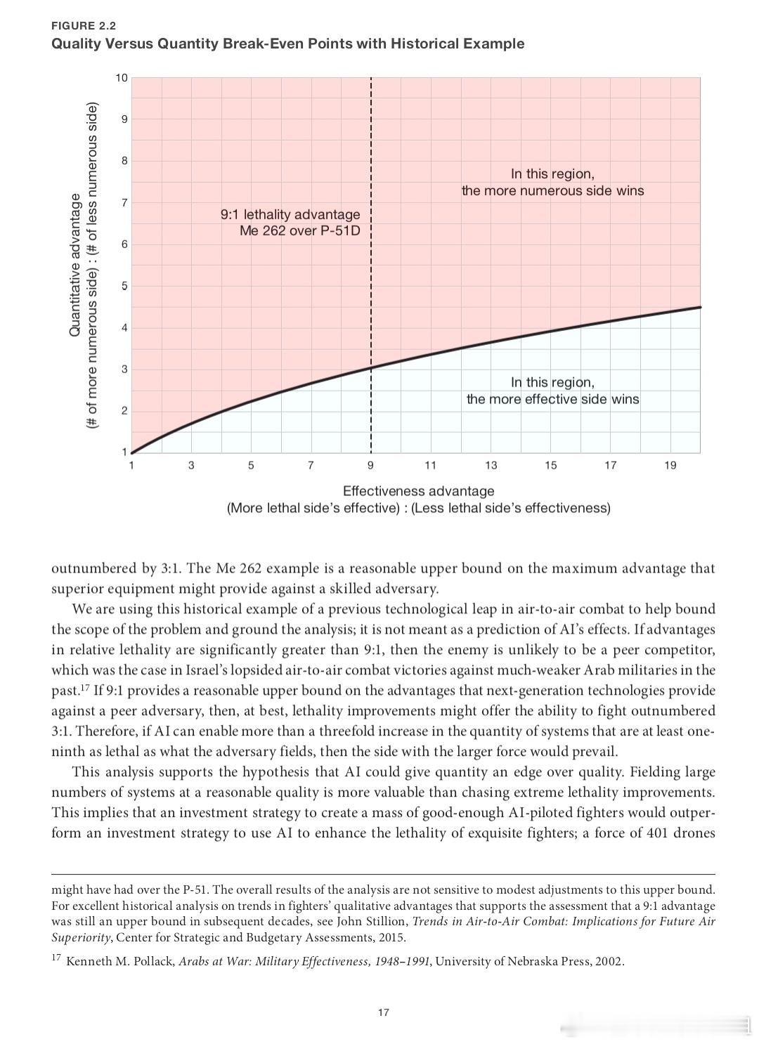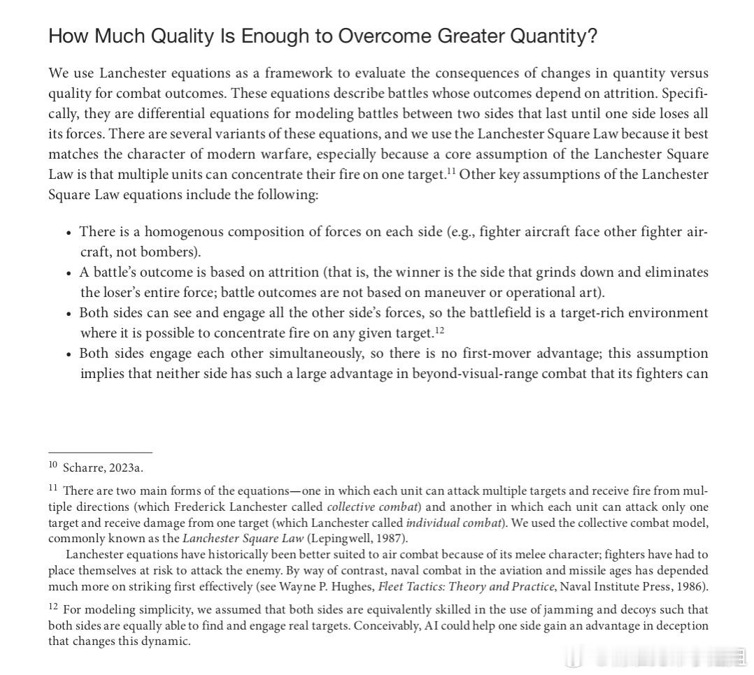 【吐槽】兰德关于人工智能作战的报告△这篇报告标题How Artificial Intelligence Could Reshape Four Essential Competitions in Future Warfare△本文主旨是论证未来战争下数量大于质量这么一个论点,其论据主要是依托图中所示的兰彻斯特方程,本人就很憋不住,兰德公司这是疯了吗,他居然用经典兰彻斯特方程,这哥们就考虑一个超视距能力相同?为啥啊,你是默认大家都放弃了研发远程打击手段吗?并且车辆驾驶都能分L1L2的,开飞机就不分了是吧,或者说是根本默认别人不搞人工智能?还有信息流转和决策算法速度都默认一样?纯教旨作战啊,这么古典,这不肯定是数量>质量嘛,因为质量都他妈一样根本掀不起风浪,搞这个触摸作战上限的计算就只是计算,甚至没有考虑战法带来的区别,人工智能作战不需要补给和通信节点?毁点瘫边不还是一样用吗,只不过就是人死的少了,并且直接将战斗力的大小作为质量优势去和数量的平方进行对比,而实际计算中通常需要考虑科技带来的指数加持,记住是指数级的区别,并且质量优势不是指一件两件武器就能战胜对手,而是指需要比对手更少的兵力就能完成任务,这是一种精兵思路,而兰德的这个则相当于运筹学里的歼八大战f22,兰德不考虑考虑你的对手可以比你质量更高数量更多吗。△科技大于我们的时候就是质量大于数量,现在不行了,开始重新论证消耗战和持久战的可行性,不过肯定不行,因为科技就是第一生产力,永远不要想单纯的通过人海优势去抵消科技对质量的加持,因为你对岸的对手已经论证过了,发现根本不行,ai也一样,更别忘了牢霉的对手是打持久战起家的。△说白了这个报告对杀伤力的提升思考过于狭隘,相对来说是为目前霉菌现在的情况所做出的评估和分析,我们不能盲目的掉入陷阱。
