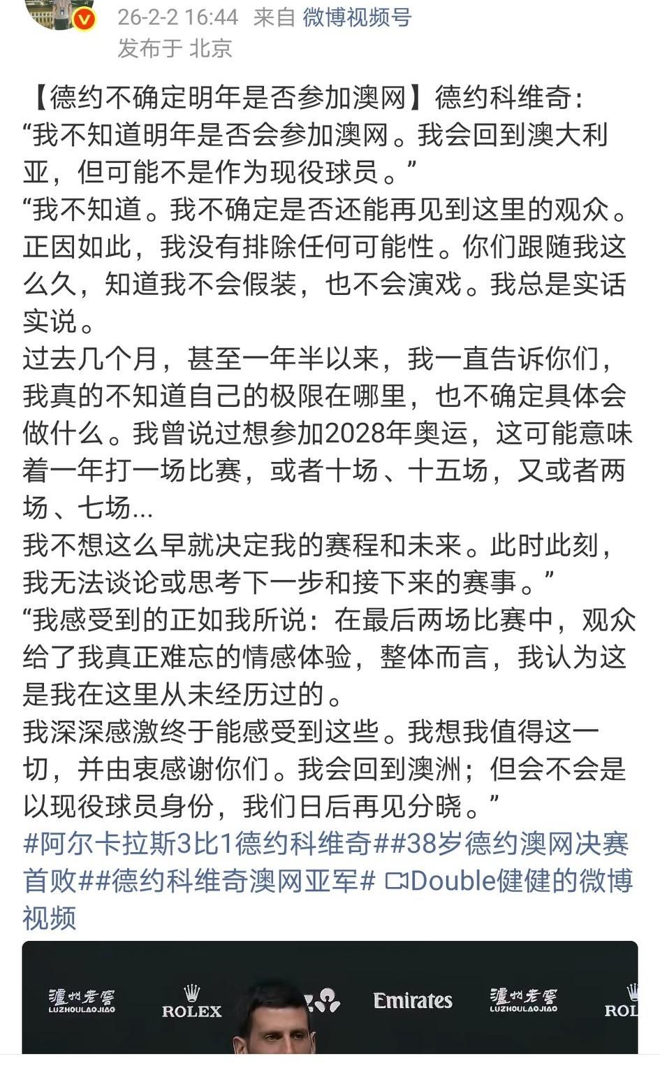 该来的还是来了!其实亚军发言的时候,最后那几句话,就有点像告别了。 德约科维奇: “我不知道明年是否会参加澳网。我会回到澳大利亚,但可能不是作为现役球员。”