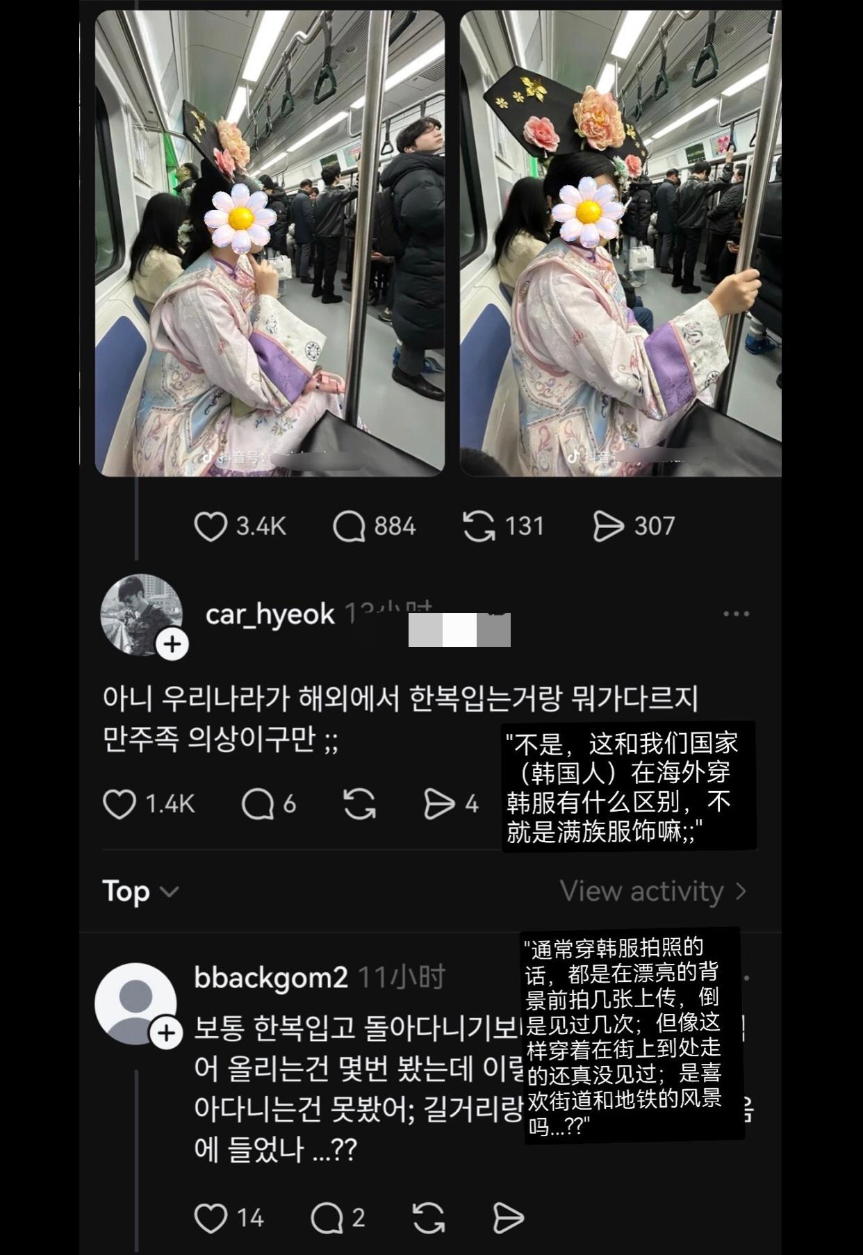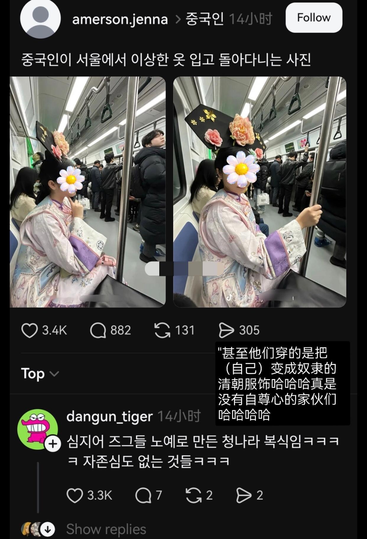 有一位女网红穿着满清的服饰,到韩国的首尔坐地铁,引发韩国网友热议并吐槽称:“中国