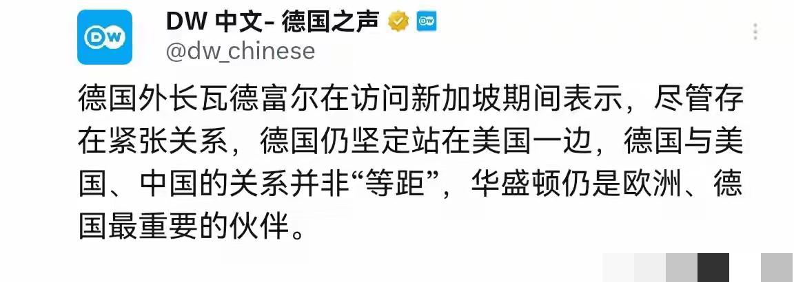 德国外长抛出“不等距论”,真是又犯糊涂了! 2月2日,正在新加坡访问的德国外长瓦德富尔宣称,尽管存在紧张关系,德国仍会坚定地站在美国那边。德国与美国、中国的关系并非“等距”,华盛顿依旧是欧洲乃至德国最为关键的伙伴。 此言一出,实在是让人对德国外长的短视与糊涂大为震惊。 美国近期在国际事务中推行单边主义与霸权行径,已令众多国家包括其盟友深受其害。欧洲也多次因美国的某些决策而陷入被动,德国外长却无视这些现实,还坚称美国是“最为重要的伙伴”,这不禁让人怀疑他是被美国的霸权光环迷了眼。 德国应当清醒地认识到,国际关系并非一场简单的选边站队游戏,而是需在不同国家间寻求平衡与合作。期望德国能以更长远、更睿智的眼光看待国际关系,为德国的利益与发展做出正确抉择。
