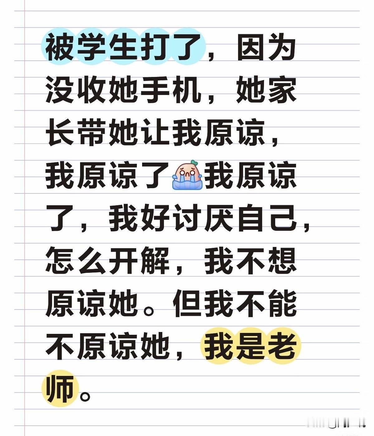 “憋屈!”一位老师在社交平台上吐槽,没收学生手机反被打,家长带着孩子来道歉,点头说了原谅。可转过身,满心都是厌恶,讨厌那个被迫妥协的自己。毕竟,我是老师,好像就只能选择原谅。学校还算有态度,给了学生严重警告处分,也同意我下学期不再教这个班。 这事曝光后,网友看了纷纷心疼:“换我肯定忍不了,老师的尊严也是尊严”! 还有网友更是坦言:“这哪是原谅,分明是逼着自己咽下委屈”。 周少想说这位老师的妥协,其实藏着太多身为教育者的无奈。老师管教学生本是分内职责,没收违规手机更是维护课堂秩序的必要手段,可换来的却是暴力相向。 被迫原谅的背后,是师道尊严的一次次退让。原谅不是因为释怀,而是因为身上的“老师”身份,容不得我们任性发泄情绪。好在学校的处分和调班安排,算是给了些许慰藉。 往后的日子,不妨多给自己一点时间消化委屈,别逼着自己和这份厌恶和解,先好好心疼一下受了伤的自己。#寻美三湘# #长沙新朋友#