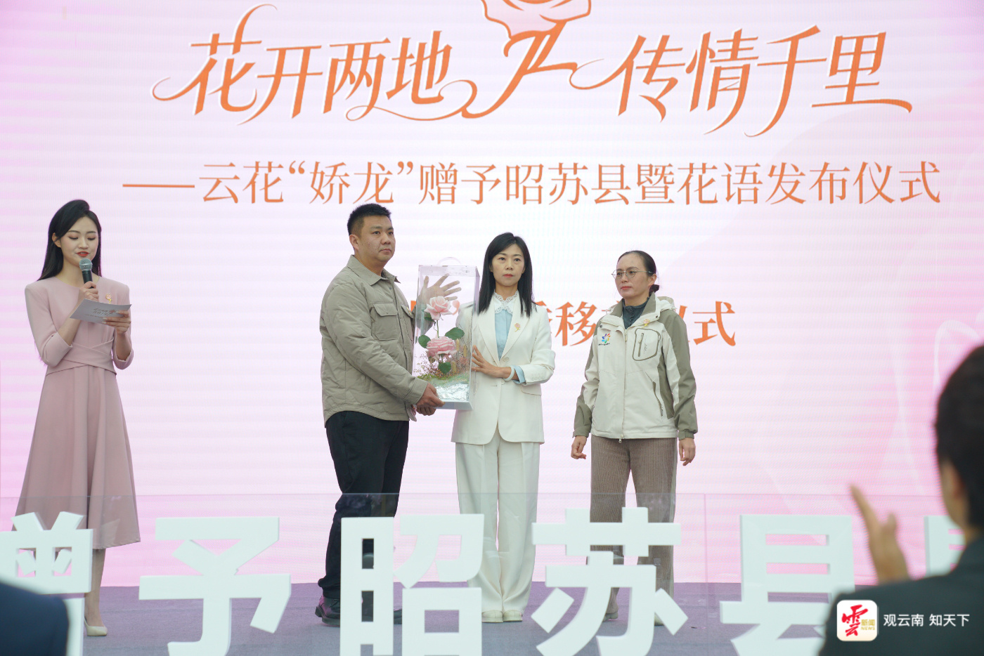 今天上午10时,“花开两地传情千里”——云花“娇龙”赠予昭苏县暨花语发布仪式在云南日报报业集团举行。昭苏县代表及贺娇龙同志亲属专程前来参加了此次活动。仪式上,云南省农业科学院花卉研究所育种团队负责人将“娇龙”月季郑重交接给昭苏县代表。