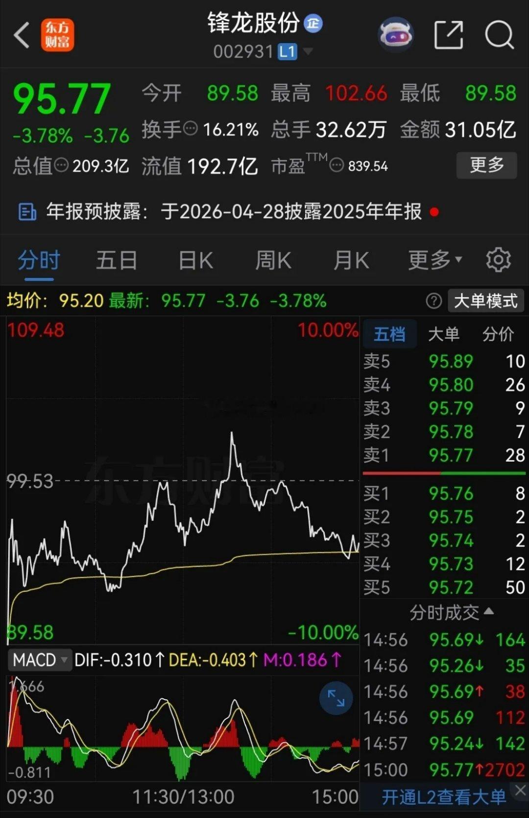 但锋龙股份今天复牌的走势却出乎意料,开盘一字跌停,随后直线拉升,盘中一度翻红,最高涨到了102.66元,涨幅一度超过3%。今天大盘暴跌102点,两市有123家公司跌停,锋龙股份收盘只跌了3.78%,而之前所有进场的股民今天都可以安全获利出来,这也算是一个善庄了。