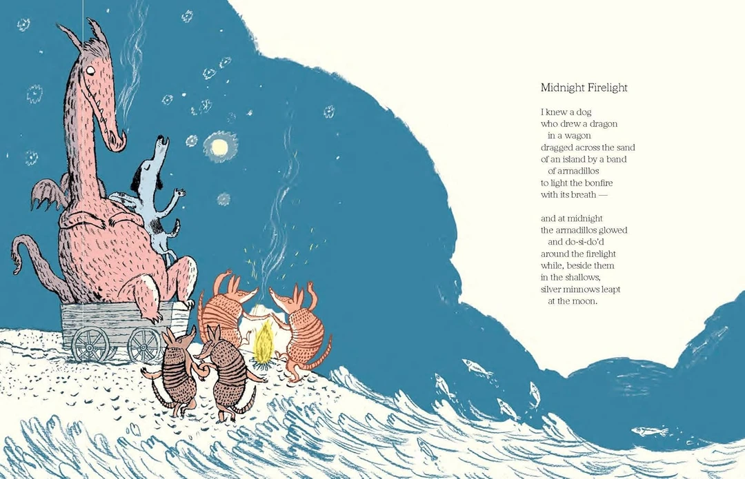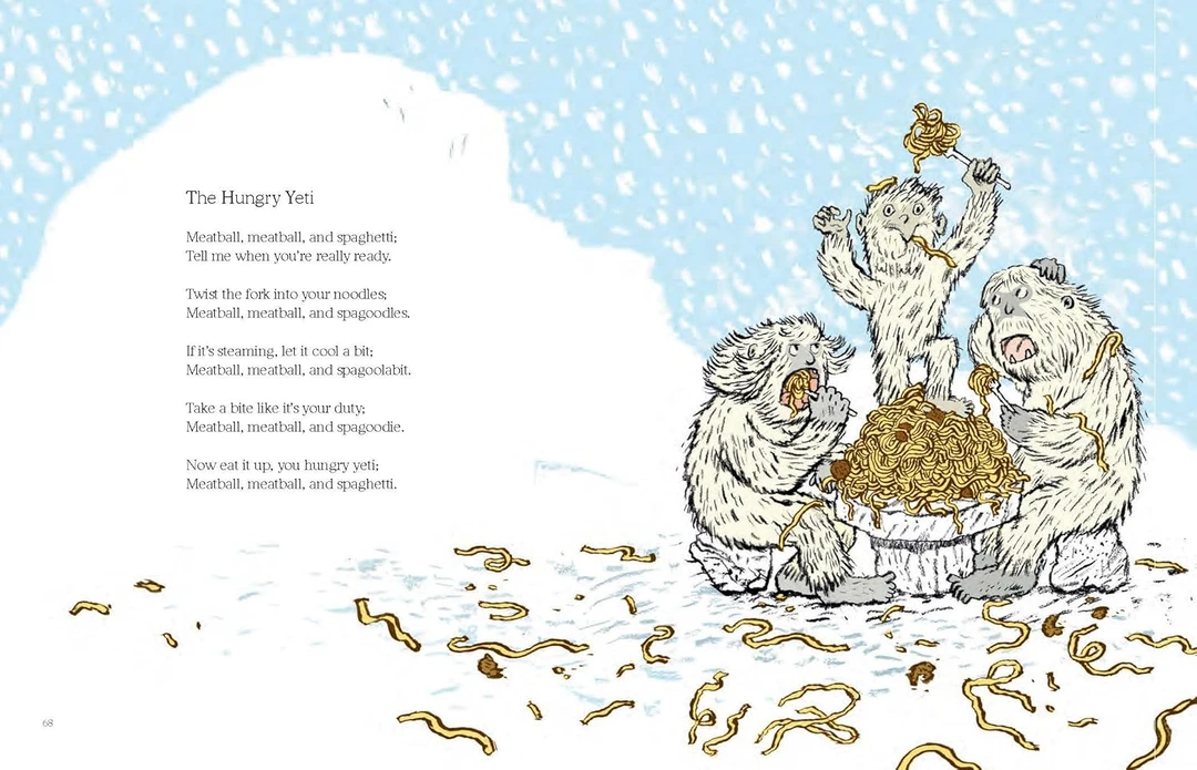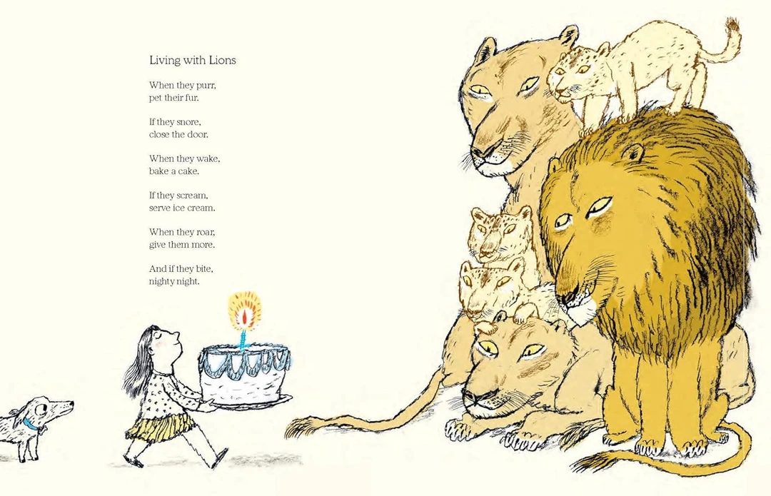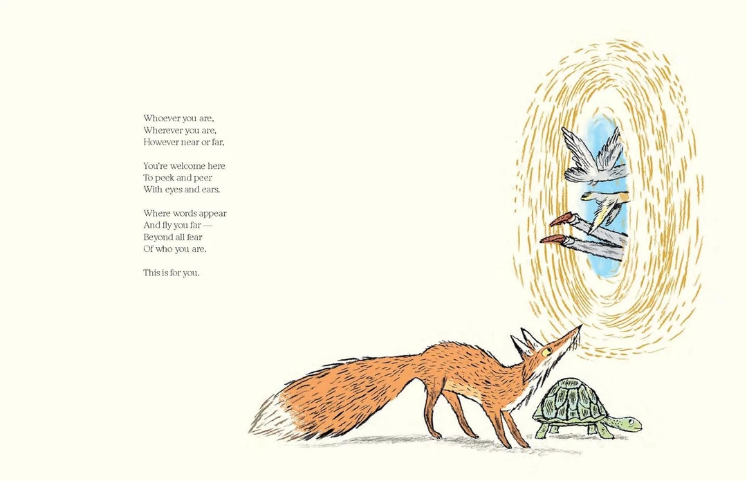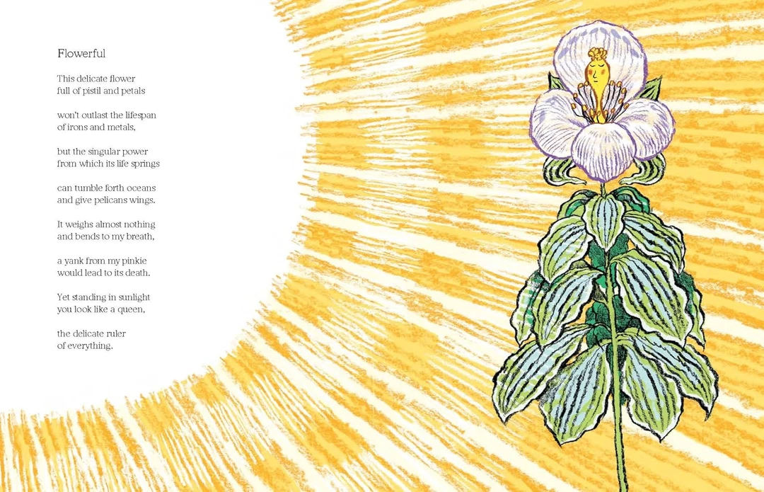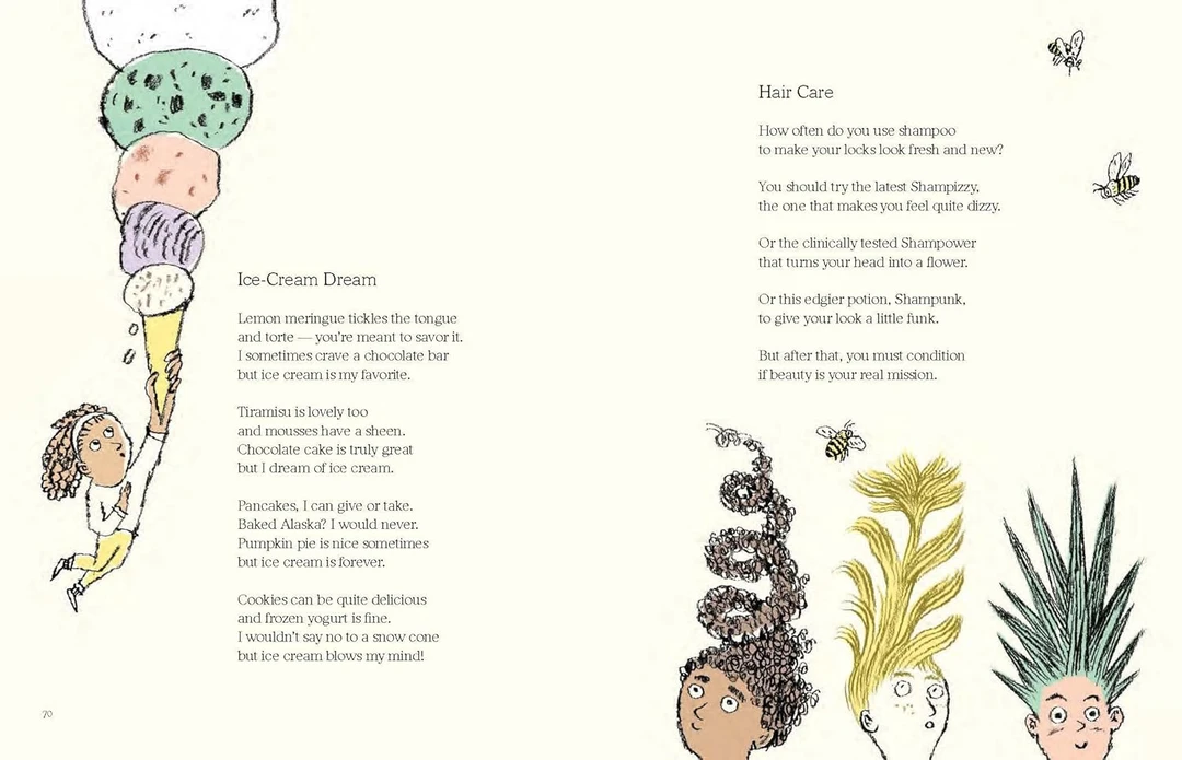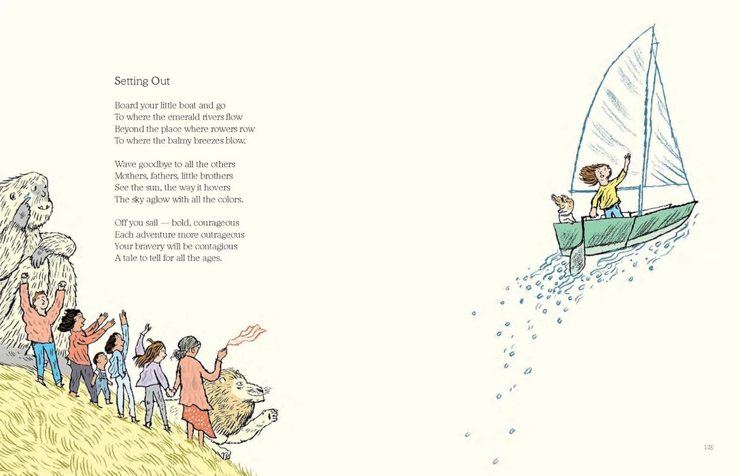 这本绘本收录 49 首原创诗歌,这些诗歌被巧妙编排进 “Welcome(欢迎)”“Wonder(惊奇)”“Wild(狂野)”“Weee!(欢呼)”“Whoops & Wallops(意外与碰撞)”“Windows(窗口)”“Whispers & Well Wishes(低语与祝福)” 七个主题板块,带小读者穿梭于日常生活的瞬间、情绪与经历中,将平凡化为非凡。比如在 “Welcome” 篇章里,作者写道:“some will say the sky is blue, /but that is only partly true. /if you take a peek above, /the clouds are dusty as a dove.”(有人说天空是蓝色的,但这只说对了一部分。若你抬头窥探,云朵如鸽子般灰蒙蒙),从独特视角引导孩子思考事物的多面性 。而在 “Wonder” 板块,“to reach the place of things unseen, /words can be your trampoline.”(要抵达那看不见的地方,文字能成为你的蹦床),鼓励孩子借助文字驰骋想象。