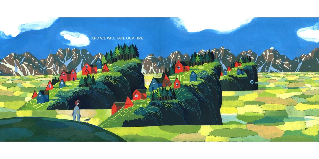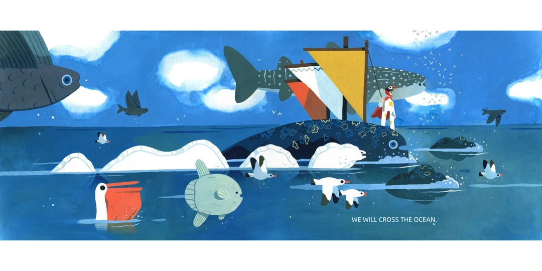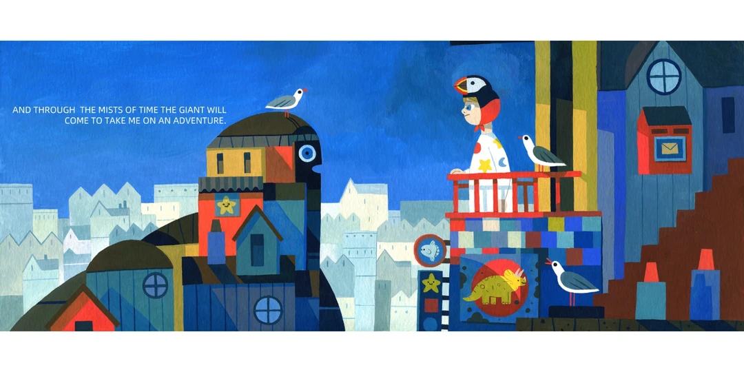 有个大巨人,朝着男孩走来。巨人看似无恶意,于是男孩决定放手一搏和巨人同行、探访新世界。他们威猛地想象自己吃大野狼、龙和猫熊的样子。接着,往山里走去,造访湖泊,在高空俯瞰整座岛屿。他们恣意让想象力驰骋,就像老鹰、像鹿,没人能阻止他们跳跃飞翔。有时,他们也会快速移动,测试自己的能耐,假装和火车赛跑…和巨人前行,从巨人的角度看世界,自己也像个巨人呢!
