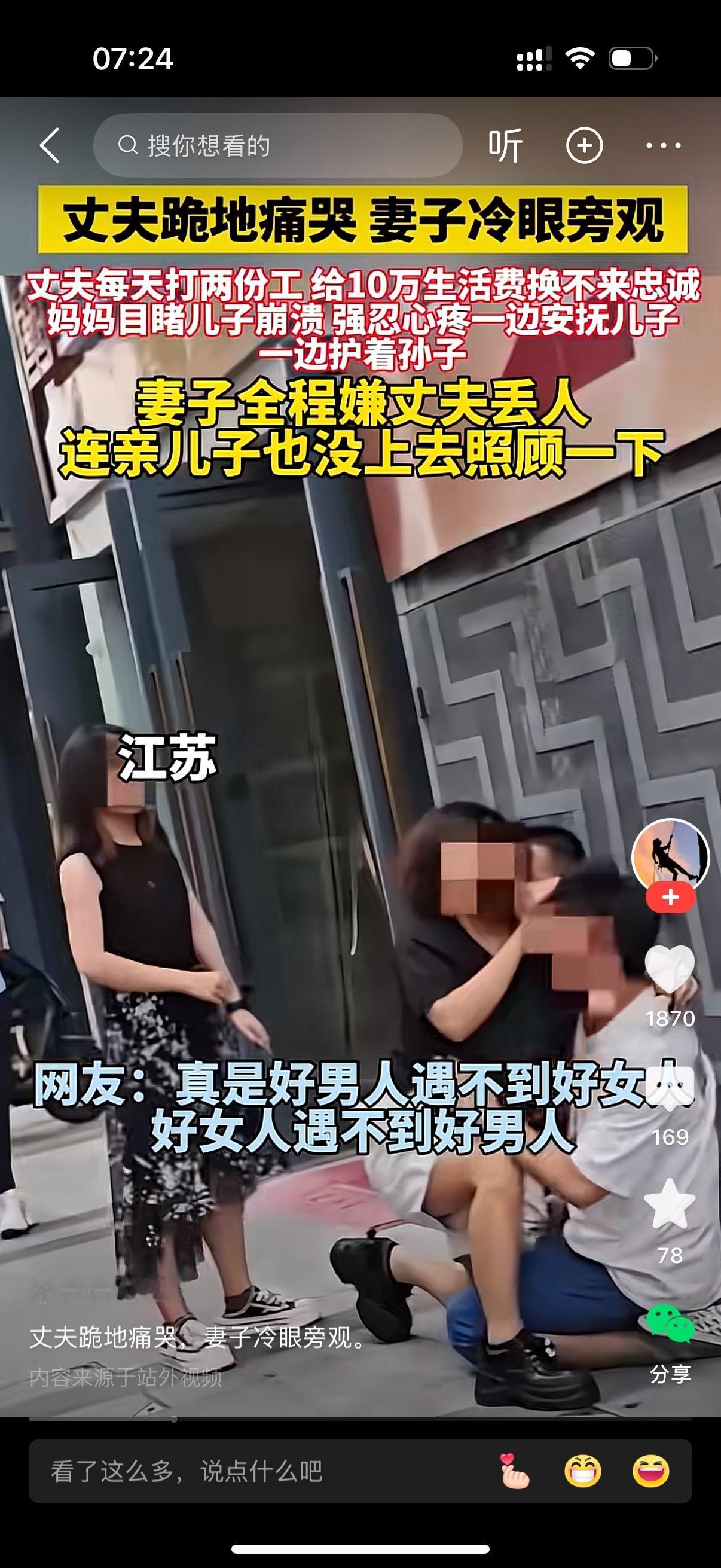 妻子出轨后提出离婚,丈夫跪地痛哭,哀求女人回心转意。女人冷眼旁观,心意已决。男人哭诉自己每天打两份工,一年给妻子10万生活费也没换来忠诚。女子全程嫌丈夫丢人,连亲儿子都没上前去照顾一下。只有男人的妈妈看着儿子崩溃,强忍心疼,一边安抚儿子,一边护着孙子。一边是妈妈的爱,一边是妻子无情的背叛。