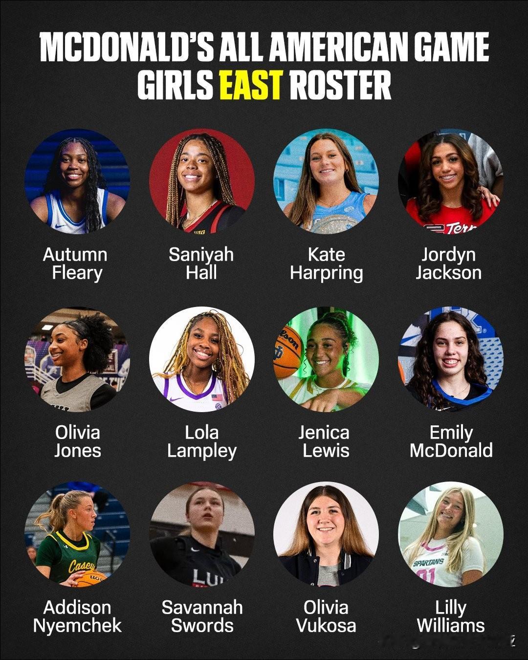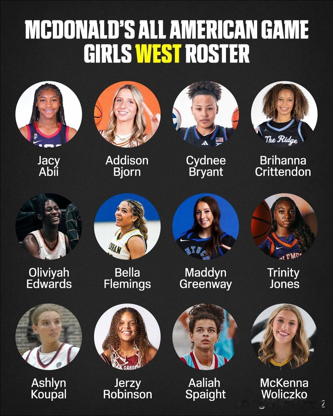 麦当劳全明星赛女篮名单出炉,Saniyah Hall是USC过去四年中的第三位全美第一,之前还有Jazzy Davidson和JuJu Watkins,德州和肯塔基各自拥有三位入选者,长角牛Brihanna Crittendon,Addison Bjorn与Aaliah Spaight,野猫Maddyn Greenway,Savvy Swords与Emily McDonald。
