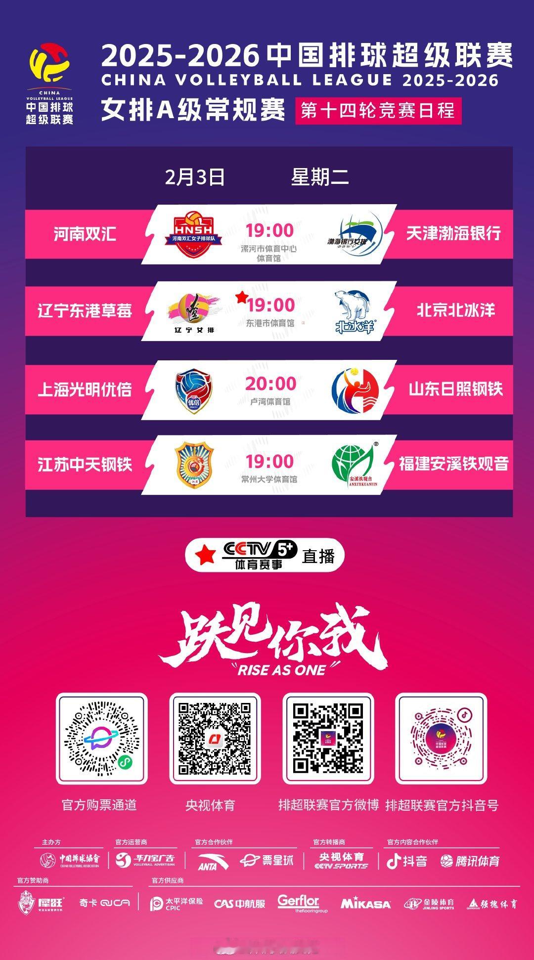 2025-2026中国女排超级联赛 A级常规赛第14轮和B级常规赛第15轮今天(2月3日)的竞赛日程: