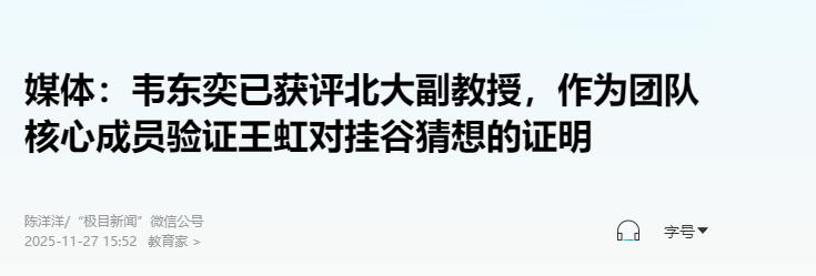 看了王虹和韦东奕  我终于搞明白了两个人的最大差距  根本不是智力上的问题,而是因为韦神太缺少能交流指导的人了。   2025年刚开年,几份学术奖项的公示名单就在圈内传开了。北京市科学技术奖杰出青年奖和国家自然科学奖的提名名单里,两个名字格外引人注目:韦东奕和王虹。   这两人同为数学天才,年纪相仿,却走出了截然不同的职业路线。   先看身处国内评价体系核心的韦东奕,他在北京大学数学学院的压力,其实并不比普通青椒小。   北大数院的人事考核是出了名的硬杠杠,韦东奕自2019年底入职助理教授,按照“六年一聘”的预聘制规定,他在2026年1月前通过评审,拿到长聘副教授资格。   在这关键的六年里,外界看到的是“韦神”的流量,而同行看到的是他发表的32篇论文。   这些文章不仅数量扎实,且大多发在国际数学顶刊上,含金量极高。他主攻流体力学中的偏微分方程难题,这种研究需要极长时间的伏案计算。他能顶住聘期考核的倒计时,在本土环境中扎实地完成研究,本身就是一种极强的职业定力。这次国家级奖项的提名,更像是对他这种“深挖式”研究的系统性认可。   与韦东奕的“本土深耕”不同,王虹代表了另一种数学家的成长路径。   她16岁就考入北大,随后远赴耶鲁深造,职业轨迹始终处于全球数学交流最活跃的地带。她所研究的调和分析领域,非常依赖前沿信息的交互和思想碰撞。   34岁的王虹今年被提名菲尔茨奖,主要成就归功于她攻克了挂谷猜想。这是数学界公认的硬骨头,而她的突破,很大程度上得益于她对全球学术资源的精准利用。   她能迅速接触到最顶尖的数学工具,并将其转化为解决陈旧难题的利刃。王虹的成功,是典型的全球协同模式下的科研加速。   今年,两位数学天才在34岁这个节骨眼上“相遇”了。一个是刚在严苛的考核中站稳脚跟,一个是正在冲击全球数学界的巅峰。   他们研究的方向也各异:调和分析更抽象,偏微分方程则直接对付动力学规律。   这反映出数学界两种完全不同的“范式”,也说明评价一个数学家的价值,标准不应该是唯一的。   说实话,韦东奕那种相对内敛的性格,确实让他少了一些国际社交,如果能有更多全球性的资源支持,他的产出效率或许还能再往上跳一跳。   但他那种不被外界节奏干扰、把自己关在办公室里死磕方程的性格,在当下这个浮躁的环境里反而更显珍贵。   这种成长的差异化,其实是评价体系的一种进步。就像胡海岚从获国家奖到评选院士的路径一样,韦东奕在2025年的这一波收获,预示着他正在完成从“天才助理教授”到“长聘学术骨干”的关键跳跃。   数学界的良性生态,既需要王虹这样引领潮流、在全球视野中拿大奖的旗手,也需要韦东奕这样守住阵地、在基础领域默默推进的基石。   数学的魅力从来不是为了比拼谁更聪明,这种多元的成长路径都被系统认可时,未来的年轻人才能有更多底气,去选择适合自己的研究方式。 信息来源:《媒体:韦东奕已获评北大副教授,作为团队核心成员验证王虹对挂谷猜想的证明》,澎湃新闻,2025年11月27日。