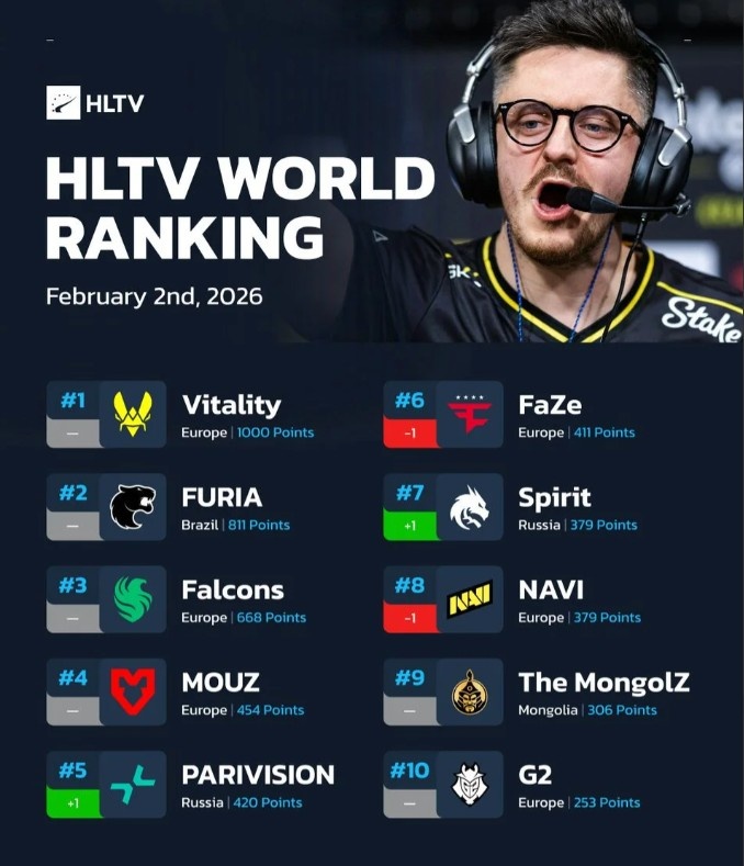 直播吧2月3日讯根据HLTV官方推特最新发布的CS2战队排名,法国豪门TeamVitality再次达到1000分大关,稳居世界第一宝座。这支由明星选手ZywOo领衔的战队凭借近期在各项赛事中的稳定发挥,成功重返积分巅峰。