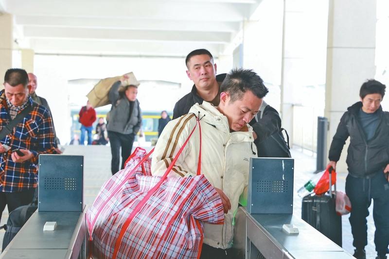 从广州返益的旅客正背着行李检票。吴巧摄