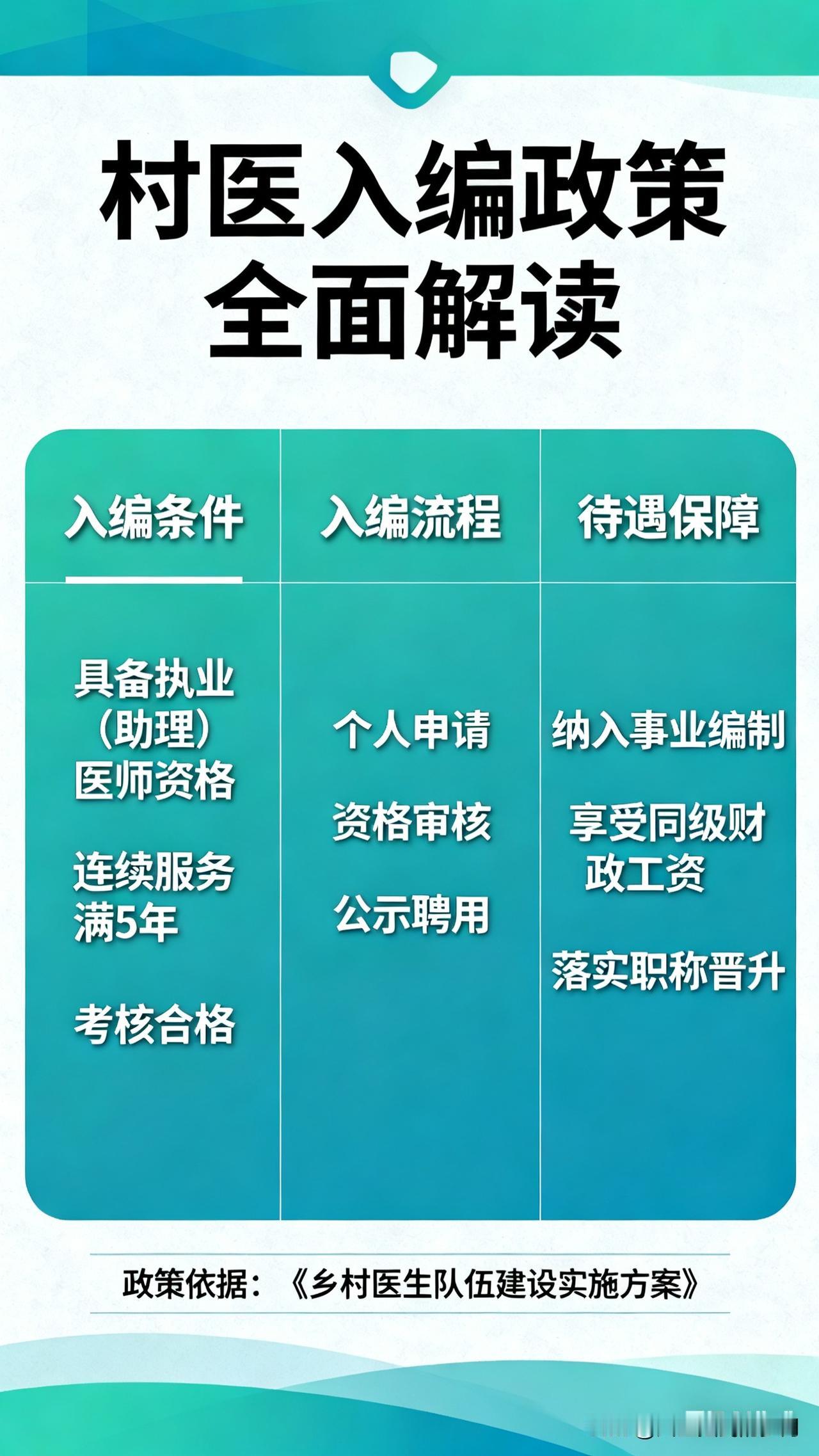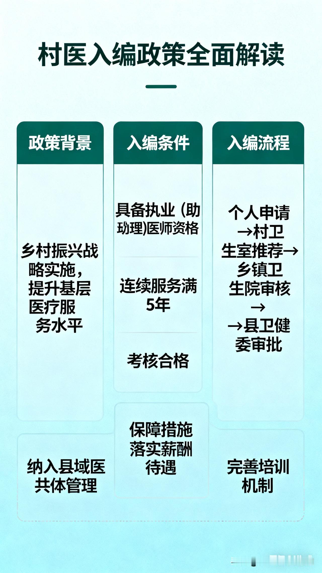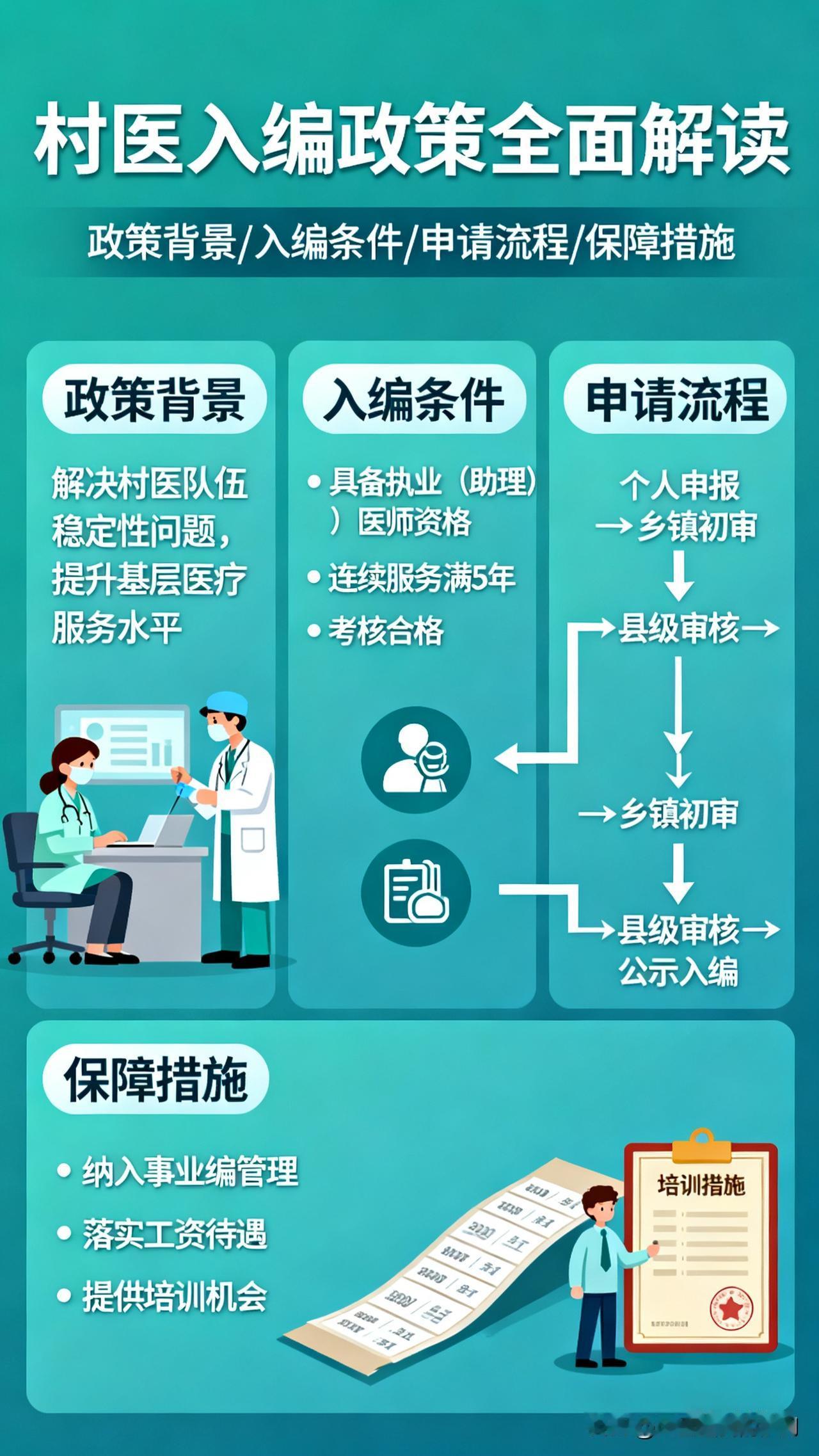 基于搜索获取的国家政策文件及多省市实施案例,我将从政策背景、核心内容、地方实践、保障机制、发展展望五个维度展开解读,系统呈现村医入编政策的全貌与实践价值。 村医入编政策全面解读:筑牢基层医疗的人才根基 乡村医生作为农村医疗卫生服务体系的“神经末梢”,承载着亿万农民的健康守护重任。长期以来,身份模糊、待遇偏低、保障不足等问题,导致基层医疗人才“引不进、留不住、干不好”,成为制约乡村医疗卫生事业发展的瓶颈。近年来,从中央到地方密集出台村医入编相关政策,通过“县管乡用、乡聘村用”等创新模式,为村医队伍注入稳定发展的“强心剂”。本文结合国家政策导向与地方实践案例,对村医入编政策进行全面解读。 一、政策出台的时代背景与核心目标 (一)政策背景:破解基层医疗人才困境 我国农村地区幅员辽阔,村卫生室作为三级医疗服务网络的“最后一公里”,是实现基本医疗和公共卫生服务全覆盖的关键载体。然而,长期以来,村医群体面临多重困境:身份上多为“个体从业者”,缺乏体制归属感;待遇上依赖医疗服务收入与有限补助,收入水平偏低;保障上养老保险缺失、职业发展通道狭窄,导致年轻人才不愿投身基层,老村医逐渐退出,村医队伍老龄化、学历偏低、技能滞后等问题日益突出。 为破解这一困境,中央一号文件多次强调推广“县管乡用、乡聘村用”政策,国家卫生健康委等10部门联合印发《关于全面推进紧密型县域医疗卫生共同体建设的指导意见》,明确提出在编制使用、人员招聘等方面向基层倾斜。2023年底,中央编办等五部门联合印发《关于做好大学生乡村医生专项计划编制保障工作的通知》,标志着村医入编政策进入系统化、规范化实施阶段。 (二)核心目标:实现“引才、留才、育才” 村医入编政策的核心目标在于构建“引得进、留得住、干得好”的基层医疗人才保障体系。通过明确村医的编制身份与待遇保障,提升岗位吸引力,吸引高校医学人才下沉基层;通过完善薪酬激励、职称评定、培训进修等机制,稳定现有村医队伍;通过规范化管理与职业化培养,提升村医专业服务能力,最终夯实乡村医疗卫生服务网底,让农村群众就近获得优质、便捷的医疗服务。 二、村医入编政策的核心内容与实施路径 (一)编制管理:专编专用,精准保障 国家政策明确,村医入编实行“专编专用、专门管理”机制,编制和人事关系归属乡镇卫生院,工作岗位派驻至村卫生室。编制来源主要分为两类:一是优先从乡镇卫生院现有事业编制内调剂;二是对调剂困难的地区,专门核增事业编制,确保大学生乡村医生等重点群体的编制保障。 为强化监管,各地需建立大学生乡村医生专项计划编制台账,实行实名制管理,严禁挪用、占用或变相使用专项编制,杜绝借核增编制之机“搭便车”套取编制的行为,确保编制资源真正用于基层医疗人才建设。 (二)入编对象与资格条件 1. 重点倾斜群体:政策优先保障大学生乡村医生入编,包括按照专项计划招录的高校毕业生,以及2020年疫情以来通过“医学专业高校毕业生免试申请乡村医生执业注册政策”进入村卫生室工作的大学生。这类群体通过事业单位公开招聘择优聘用后,可直接纳入乡镇卫生院事业编制管理。 2. 在岗村医认定:对于现有在岗村医,各地普遍要求纳入乡村一体化管理,通过“乡聘村用”签订劳动合同,实现待遇等同入编。如河北省明确,纳入一体化管理的在岗乡村医生,收入水平不低于乡镇卫生院同类在职在编人员;江苏省则规定,取得执业(助理)医师资格、在村卫生室工作满6年的村医,可通过定向招聘纳入编制。 3. 资格门槛优化:相较于以往对执业医师、主治医师资格的严格要求,现行政策显著降低了入编评聘门槛,更注重实践能力与服务年限。如甘肃省规定,在村卫生室连续执业10年以上、年龄45周岁以下、取得执业医师资格且群众反映好的村医,可通过公开招聘纳入编制。 (三)待遇保障:同工同酬,多劳多得 村医入编后的待遇保障实现全方位升级,核心体现为“编内待遇等同化、薪酬结构多元化”: - 基本待遇:基本工资和基础性绩效工资参照同类事业编制人员标准执行,同时缴纳“五险一金”,部分地区还建立职业年金制度,解决村医的后顾之忧。如山东单县的入编村医可享受“五险一金+绩效奖励”,重庆未入编村医也可参照事业编制标准发放工资。 - 激励机制:奖励性绩效工资与基本公共卫生服务、基本医疗、家医签约等工作完成情况挂钩,充分体现“多劳多得、优绩优酬”。如河南省明确,奖励性绩效根据工作实绩核定,激发村医服务积极性。 - 福利保障:入编村医享有与同类事业编制人员同等的职称评定、评优评先、培训进修、假期及工会福利等权益。如贵州省为入编大学生村医提供免费培训及进修机会,要求3年内考取执业(助理)医师资格证。 (四)管理与考核:权责清晰,动态监管 村医入编后实行规范化管理,形成“县统筹、乡管理、