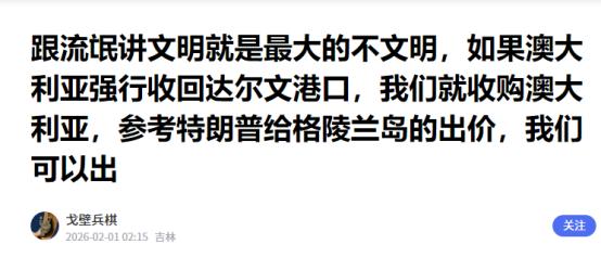 跟流氓讲文明就是最大的不文明,如果澳大利亚强行收回达尔文港口,我们就收购澳大利亚,参考特朗普给格陵兰岛的出价,我们可以出30亿美金 要知道,当时澳大利亚联邦政府可是全程没提任何“国家安全”异议,现在跳出来反对的那些人,当年一个个都装哑巴呢,澳大利亚前北领地总检察长约翰·埃尔芬克后来都忍不住辩护,说当时联邦政府根本没兴趣给港口投钱,是岚桥解了燃眉之急。 谁也没想到,这个没人要的烂摊子,在岚桥手里真的起死回生了。岚桥可不是光画大饼,接手后真金白银地砸钱改造:码头加固、航道疏浚、泊位升级,还新建了东臂物流园区和海上补给中心,后来又搞了城市邮轮码头。 更实在的是,岚桥实际投的钱远比承诺的多,截至2026年累计投资已经超10亿澳元,开通了12条新航线,硬生生把一个破败港口打造成了现代化枢纽。 数据不会说谎:2015年达尔文港的年吞吐量才1600万吨,到2025财年直接突破3000万吨,翻了将近一倍;从当年年亏3700万澳元的“拖油瓶”,变成了年盈利960万澳元的香饽饽,给北领地政府带来的税收也从2100万澳元涨到了7800万澳元。 更难得的是,岚桥还真心实意回馈当地,港口100名员工里90%以上是澳大利亚本地人,每年还拿出近20万澳币捐助社区,支持原住民青少年职业发展、赞助当地节日和慈善事业,妥妥的双赢典范。 可就在这港口刚盈利、前景一片大好的时候,澳大利亚却开始“变脸”了。2025年澳大利亚联邦大选期间,不管是执政党还是反对党,都把达尔文港当成了竞选筹码,互相攀比着喊“收回港口”的口号。 阿尔巴尼斯政府上台初期还装模作样缓和对华关系,取消了部分贸易限制,让澳洲农产品重新进入中国市场,可转头就把竞选承诺捡了起来,明确说要把港口拿回去,这前后矛盾的嘴脸真是让人不齿。 要说澳大利亚为啥突然翻脸,说白了就是背后有美国在捣鬼。 中国驻澳大使肖千说得一针见血:亏损的时候把港口租给中企,赚钱了就想改规则收回,这根本不符合商业逻辑,也不是合作该有的样子。 要知道,中国是澳大利亚最大的贸易伙伴,上一财年双边货物与服务贸易额高达3090亿澳元,占澳大利亚对外贸易总量的24%,澳洲的农业、矿业、教育服务业都离不开中国市场。 之前中加关系紧张时,中国还特意给澳大利亚下达了54万吨油菜籽订单,算是给足了缓和关系的诚意,可澳大利亚偏偏要往歪路上走。 更重要的是,澳大利亚这波操作连自己人都看不下去。 这时候就不得不提特朗普当年的闹剧了。2019年特朗普突然脑洞大开,想把格陵兰岛买下来,还喊出了30亿美金的出价,结果被丹麦和格陵兰岛方面狠狠拒绝,成了国际笑柄。 后来有专家估算,要真买下格陵兰岛,算上安置费、福利补贴和基础设施投资,至少得花1万亿美元,特朗普那30亿美金简直就是打发要饭的。 现在澳大利亚既然想耍流氓收回达尔文港,那咱也不妨学学特朗普的思路,直接出价30亿美金收购整个澳大利亚,反正按他们的逻辑,领土买卖也不是不能谈,而且30亿美金买个偌大的澳洲,比特朗普的出价可实在多了! 当然,这只是个调侃式的反制思路,咱可不是真要搞领土买卖,核心是想告诉澳大利亚:别以为中国企业好欺负,背信弃义是要付出代价的。岚桥集团通过公开竞标、合法合规拿到达尔文港的经营权,十年间砸真金白银改造,给澳大利亚带来了实实在在的利益,这是有目共睹的事实。 现在澳大利亚想撕毁合同,不仅会让岚桥的合法权益受损,更会让所有在澳投资的中企心寒,以后谁还敢相信澳大利亚的商业环境? 要我说,澳大利亚真该好好掂量掂量。 中国一直本着互利共赢的态度和澳洲合作,可合作的前提是相互尊重、遵守契约精神。如果澳大利亚非要跟着美国当“马前卒”,在达尔文港问题上一意孤行,那中方势必会采取反制措施,到时候受损的可不只是一个港口的经营权,而是整个中澳关系和澳大利亚的经济利益。 毕竟“跟流氓讲文明就是最大的不文明”,对付这种卸磨杀驴的主儿,就得让他们知道,耍流氓是要付出代价的。达尔文港的故事,本质上就是一面照妖镜,照出了澳大利亚的双标和短视,也照出了美国在背后操纵的黑手。但中国企业的实力和诚意摆在这里,中澳合作的双赢前景也摆在这里。 希望澳大利亚能迷途知返,别被政治操弄冲昏了头脑,否则最后只能是搬起石头砸自己的脚。要是真执迷不悟非要收回港口,那咱30亿美金收购澳大利亚的提议,可就不是开玩笑了,毕竟对付流氓,就得用流氓能听懂的语言!