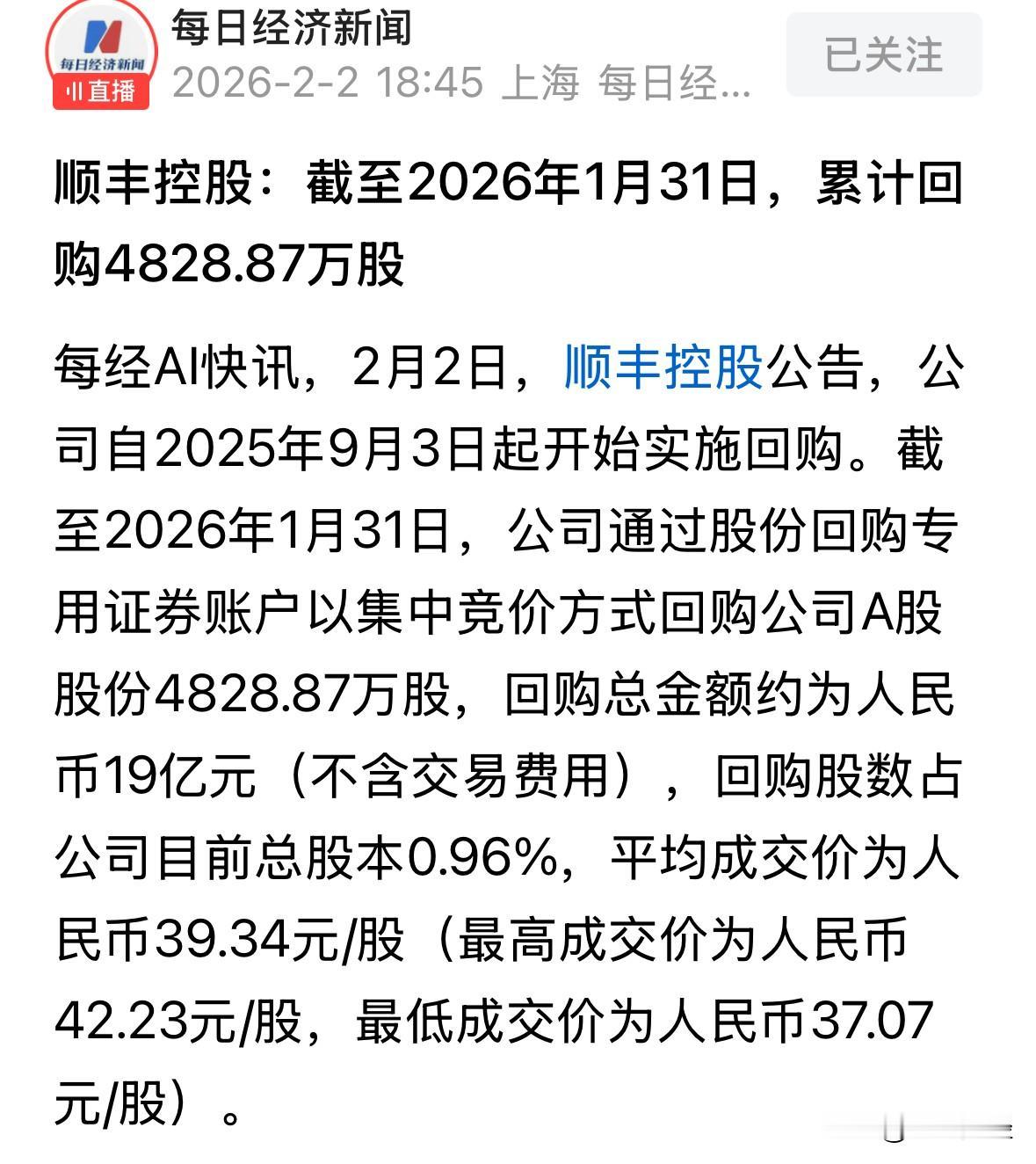 顺丰控股这花19亿元回购,对股价的托举效率几乎为零。回购最高42.23元,最低37.07元,收购均价39.34元,总计回购4828万股,约占总股本的1%。而今现价37.37元,每股浮亏2.0元,几乎浮亏了1亿元。顺丰目前1880亿元的总市值,历史上最高121元(除权后),这又谁知道上面有多少的套牢盘呢,等待解救。 乐呀财经