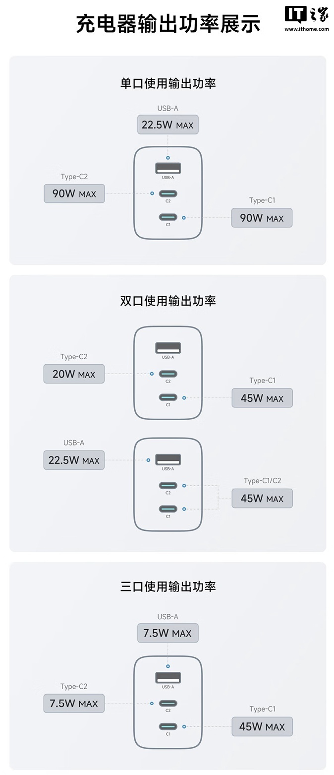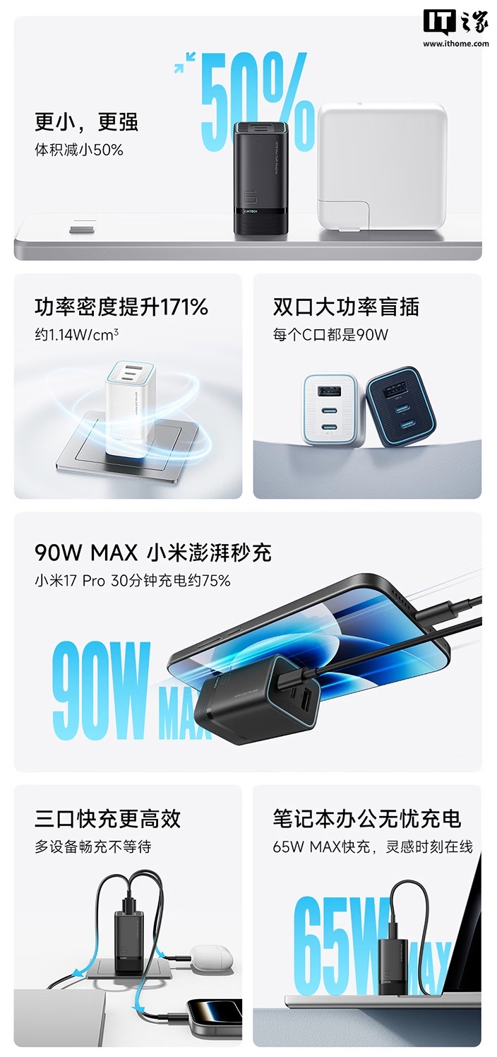 这款充电器支持小米90WMAX澎湃秒充,功率密度提升171%(约1.14W/cm²),每个C口都是90W。