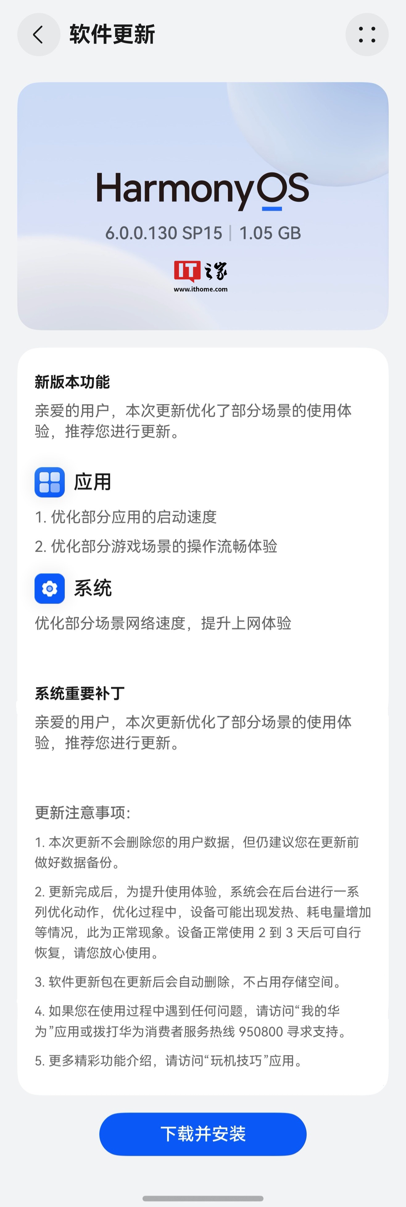 IT之家附华为鸿蒙HarmonyOS6.0.0.130SP15版本更新内容如下: