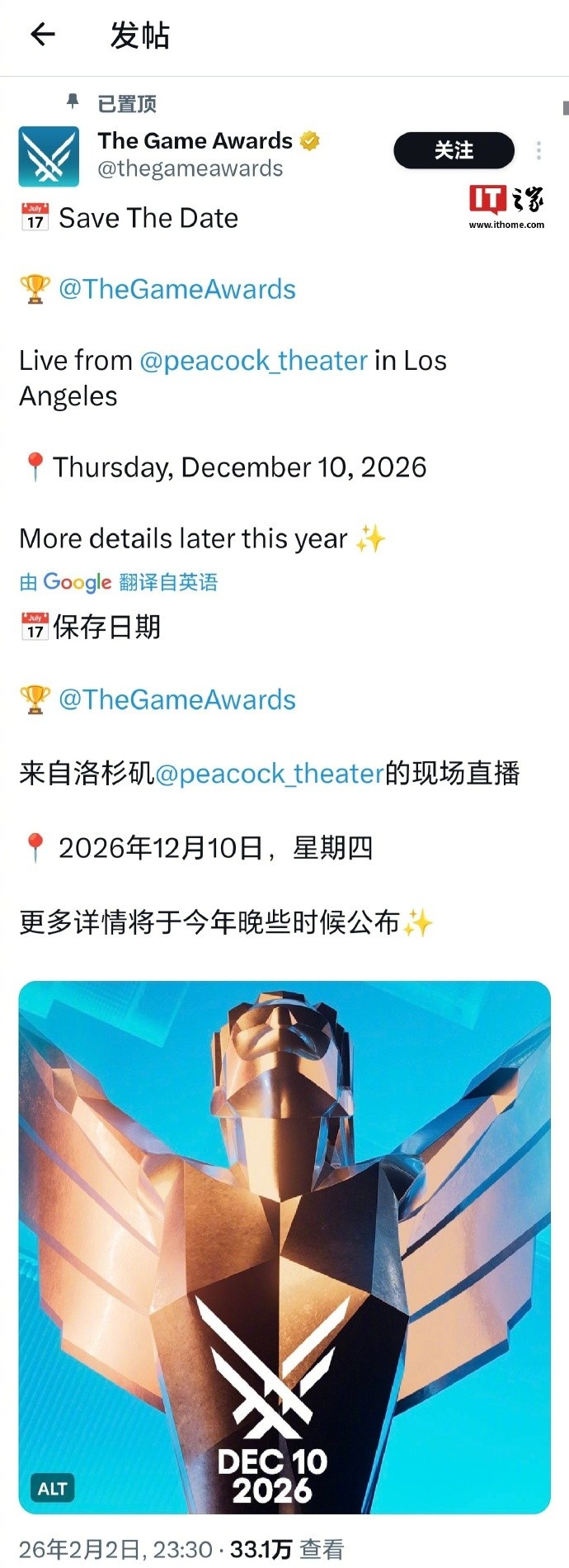 直播吧2月3日讯TGA官方公布了2026年TGA年度游戏颁奖典礼的颁奖时间,今年的TGA将于当地时间12月10日(北京时间12月11日)在洛杉矶举行,和往年一样也将进行全程现场直播。