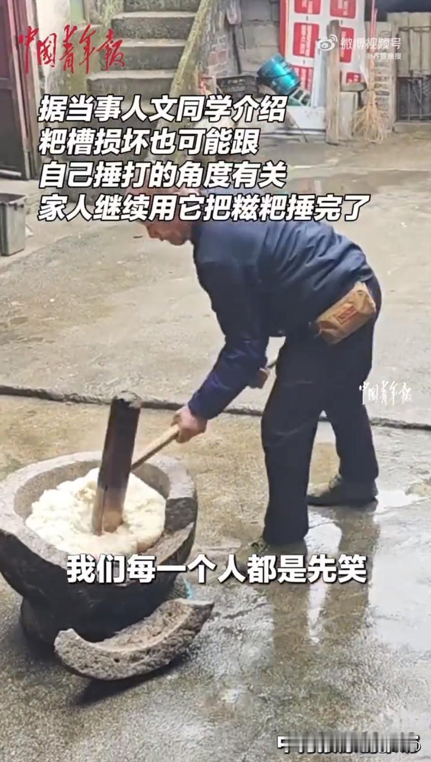 贵州一位大学生放假回家体验打糍粑,结果一个操作把家里传了百来年的祖传粑槽给捶坏了