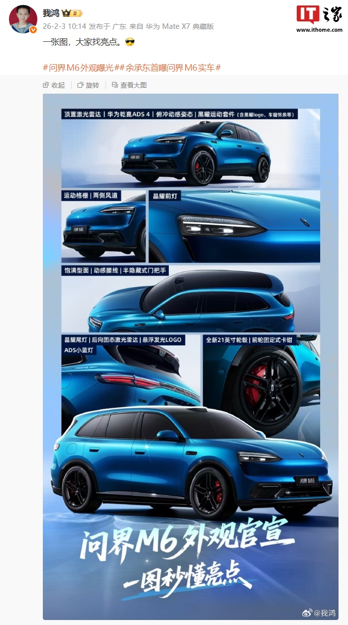 IT之家注意到,博主@我鸿今日分享了鸿蒙智行问界M6的外观亮点一图知。