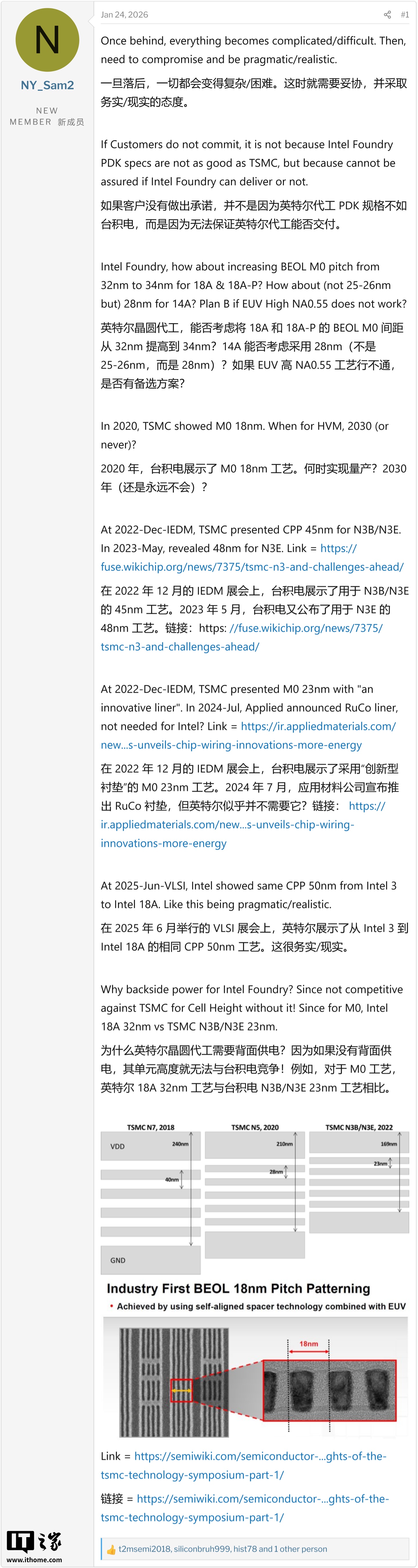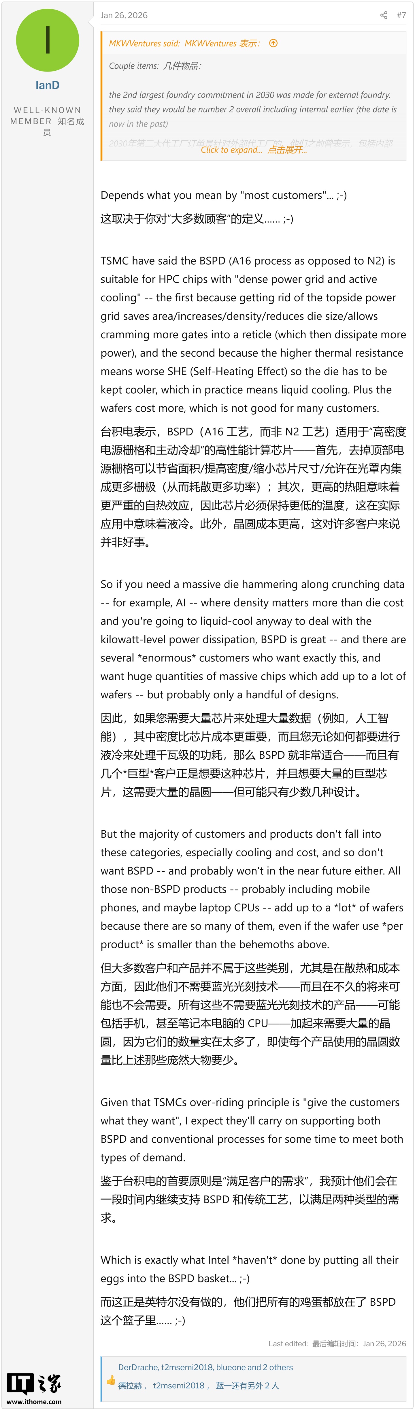 行业专家IanD指出在保持相同芯片核心温度(Hotspots)的前提下,采用BSPD技术的芯片需要散热器温度降低约20°C才能维持热平衡。IT之家附上相关截图如下: