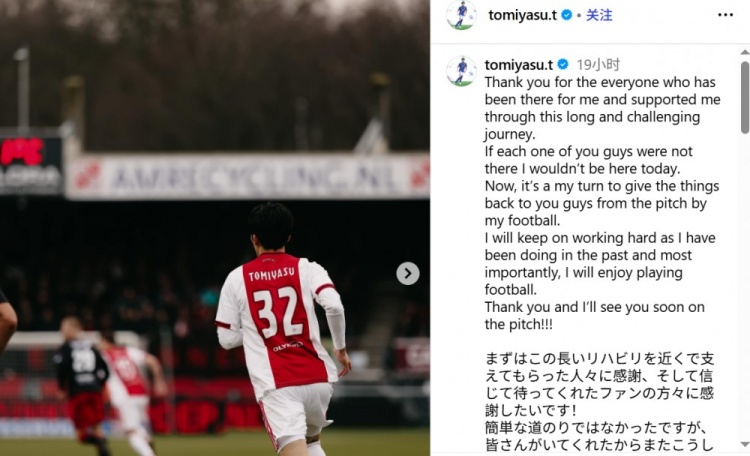 直播吧2月3日讯阿贾克斯球员富安健洋更新社媒,纪念自己重返球场。