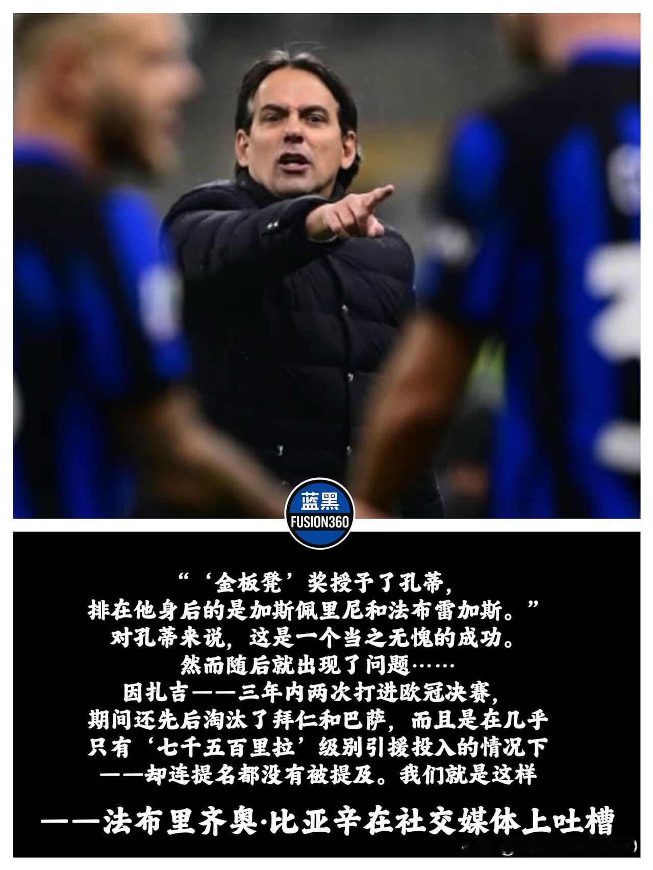 离谱给离谱TM开门!三年两进欧冠决赛的因扎吉,连前三都不配?意大利同行真是瞎了心! 今天,意大利足坛正式成了一个笑话。 刚刚揭晓的“金板凳奖”让人看傻了。给孔蒂颁奖,行,我们捏着鼻子认了,毕竟带那不勒斯有成绩。 但让人把桌子掀了的是:西蒙尼·因扎吉,竟然连前三名的门槛都没摸到! 排在他前面的是谁?除了孔蒂,还有加斯佩里尼,甚至还有带科莫升级的法布雷加斯!相信看到这份获奖名单,能将所有内拉祖里的火都点着了。 比亚辛直接开喷:“这就是意大利人的德行!” 他在社交媒体上那叫一个阴阳怪气,但句句在理: “孔蒂获奖实至名归,但因扎吉呢?”“一个拿着‘7500里拉’(预算约为零)的转会费,三年内两次杀入欧冠决赛,连克拜仁和巴萨的主教练,居然连个提名都不配?” 这就不是投票了? 帕尔梅里的话更直接:“难怪他会恶心地离开。” 同行们投出的这个结果,完美解释了一个残酷的事实——为什么因扎吉最终会选择“恶心”地离开意大利。 在这个圈子里,你在欧洲赛场给意大利挣再多面子,也不如他们在窝里横值钱。这波操作,真的太“意甲”了。外战内行被无视,内战内行被捧上天。 因扎吉不欠意大利足球什么,是意大利足球配不上因扎吉!国际米兰 💙🖤