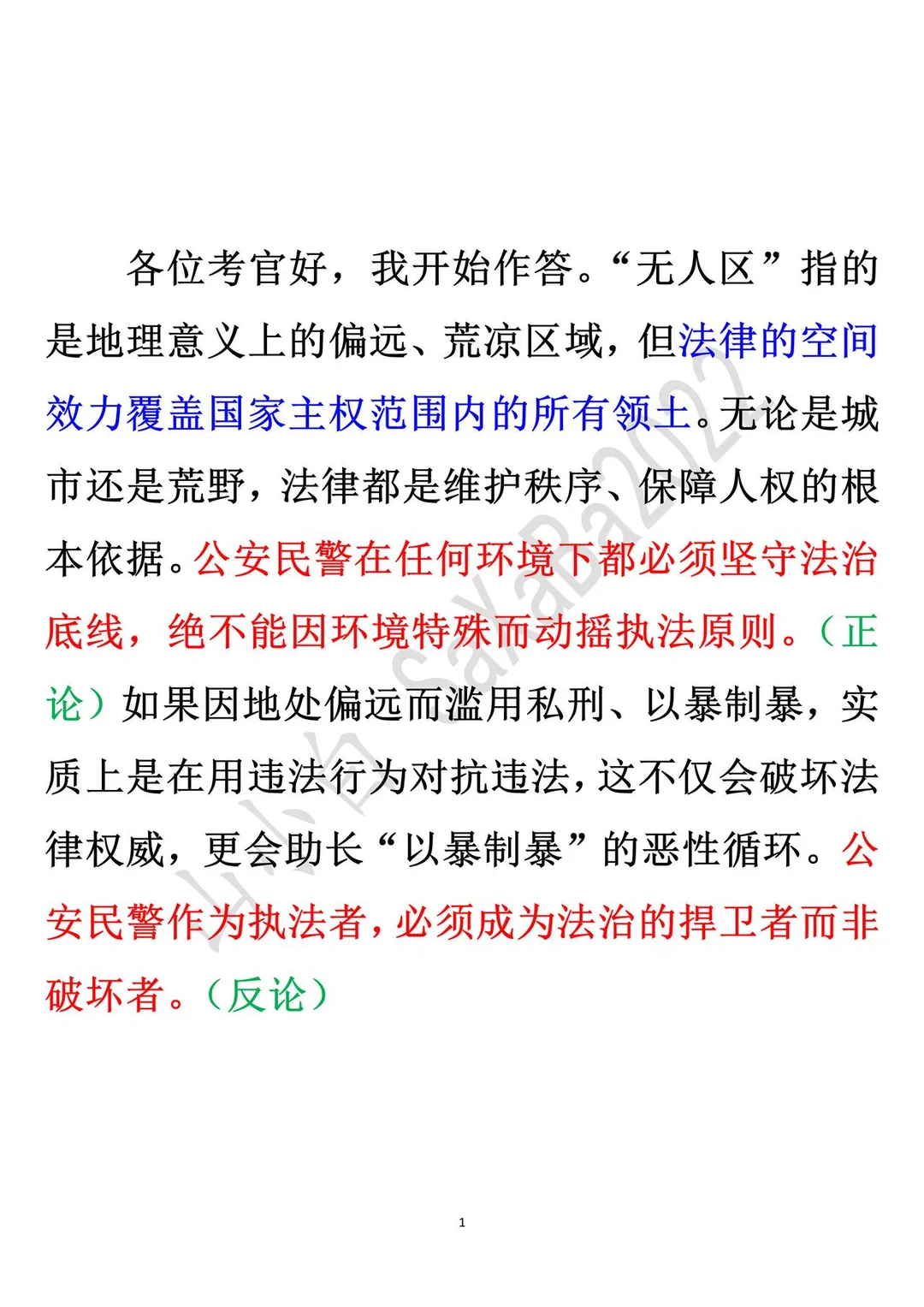 ◆各位考官好,我开始作答。“无人区”指的是地理意义上的偏远、荒凉区域,但法律的空间效力覆盖国家主权范围内的所有领土。无论是城市还是荒野,法律都是维护秩序、保障人权的根本依据。公安民警在任何环境下都必须坚守法治底线,绝不能因环境特殊而动摇执法原则。(正论)如果因地处偏远而滥用私刑、以暴制暴,实质上是在用违法行为对抗违法,这不仅会破坏法律权威,更会助长“以暴制暴”的恶性循环。公安民警作为执法者,必须成为法治的捍卫者而非破坏者。(反论)
