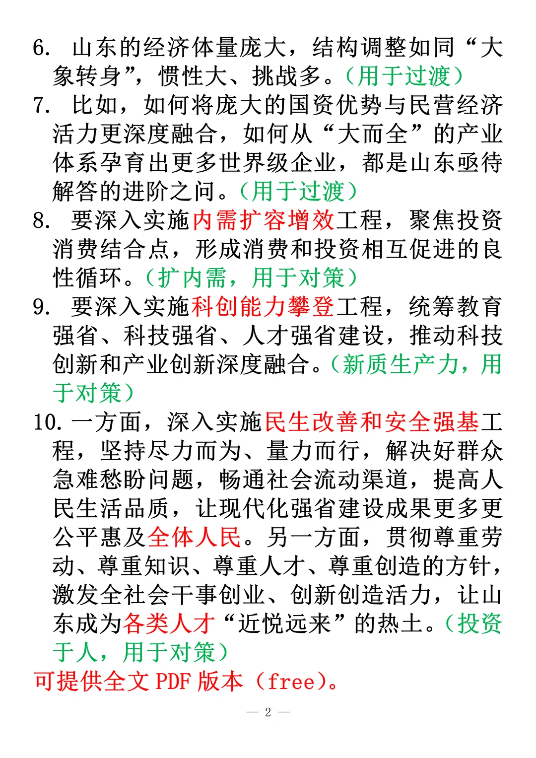 10.一方面,深入实施民生改善和安全强基工程,坚持尽力而为、量力而行,解决好群众急难愁盼问题,畅通社会流动渠道,提高人民生活品质,让现代化强省建设成果更多更公平惠及全体人民。另一方面,贯彻尊重劳动、尊重知识、尊重人才、尊重创造的方针,激发全社会干事创业、创新创造活力,让山东成为各类人才“近悦远来”的热土。(投资于人,用于对策)