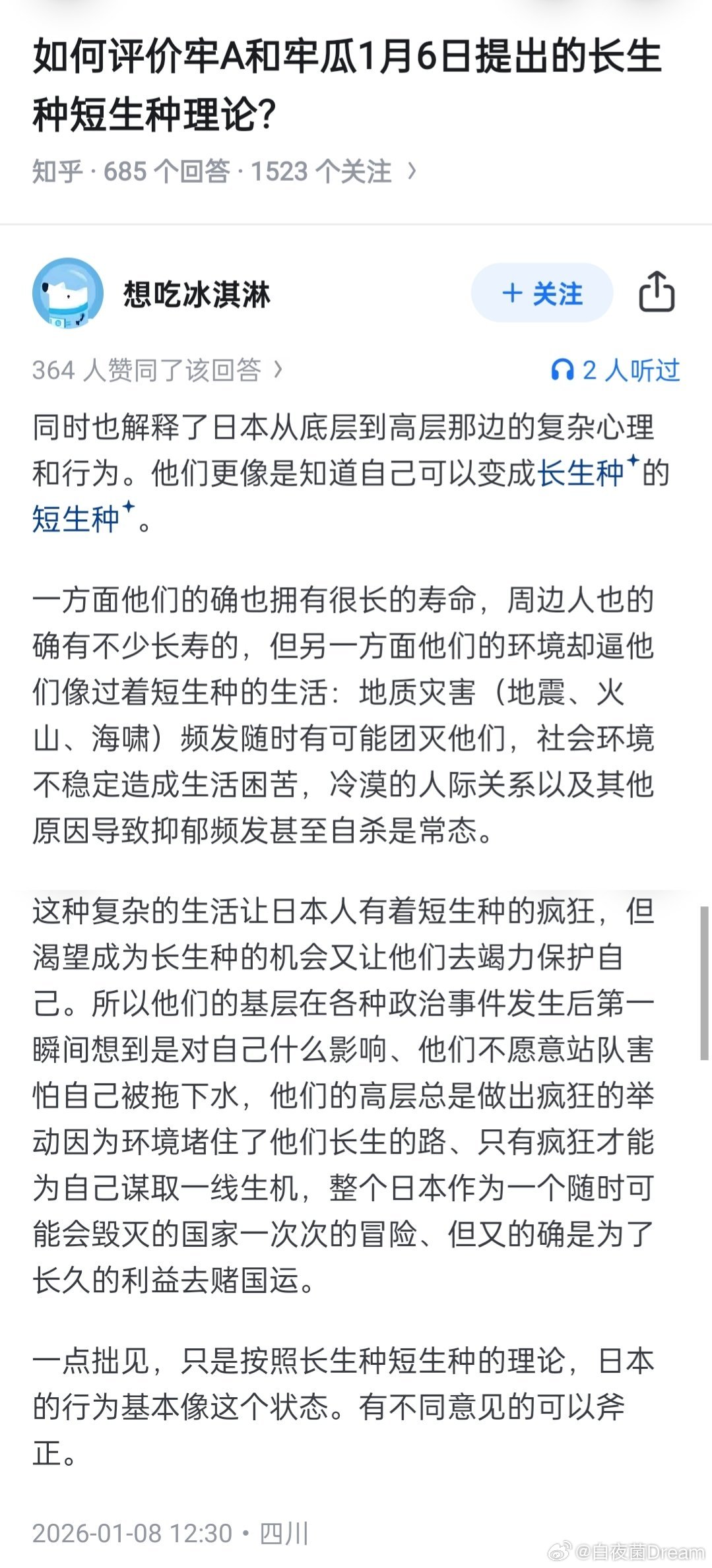 🔻牢A牢瓜的长生种短生种理论,解释了日本从底层到高层的复杂心理和行为。🔻一方面日本人看起来确实有很长的寿命,但另一方面环境却让日本人过着短生种的生活。牢A谈日本热点现场