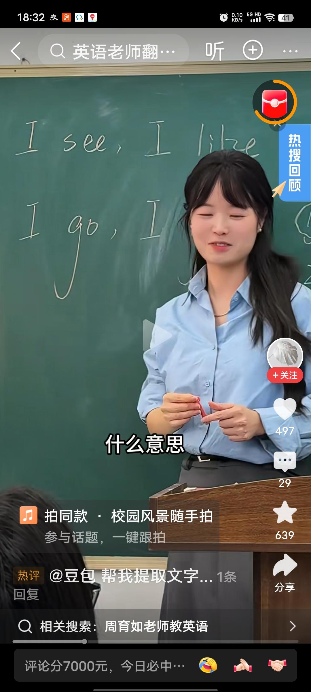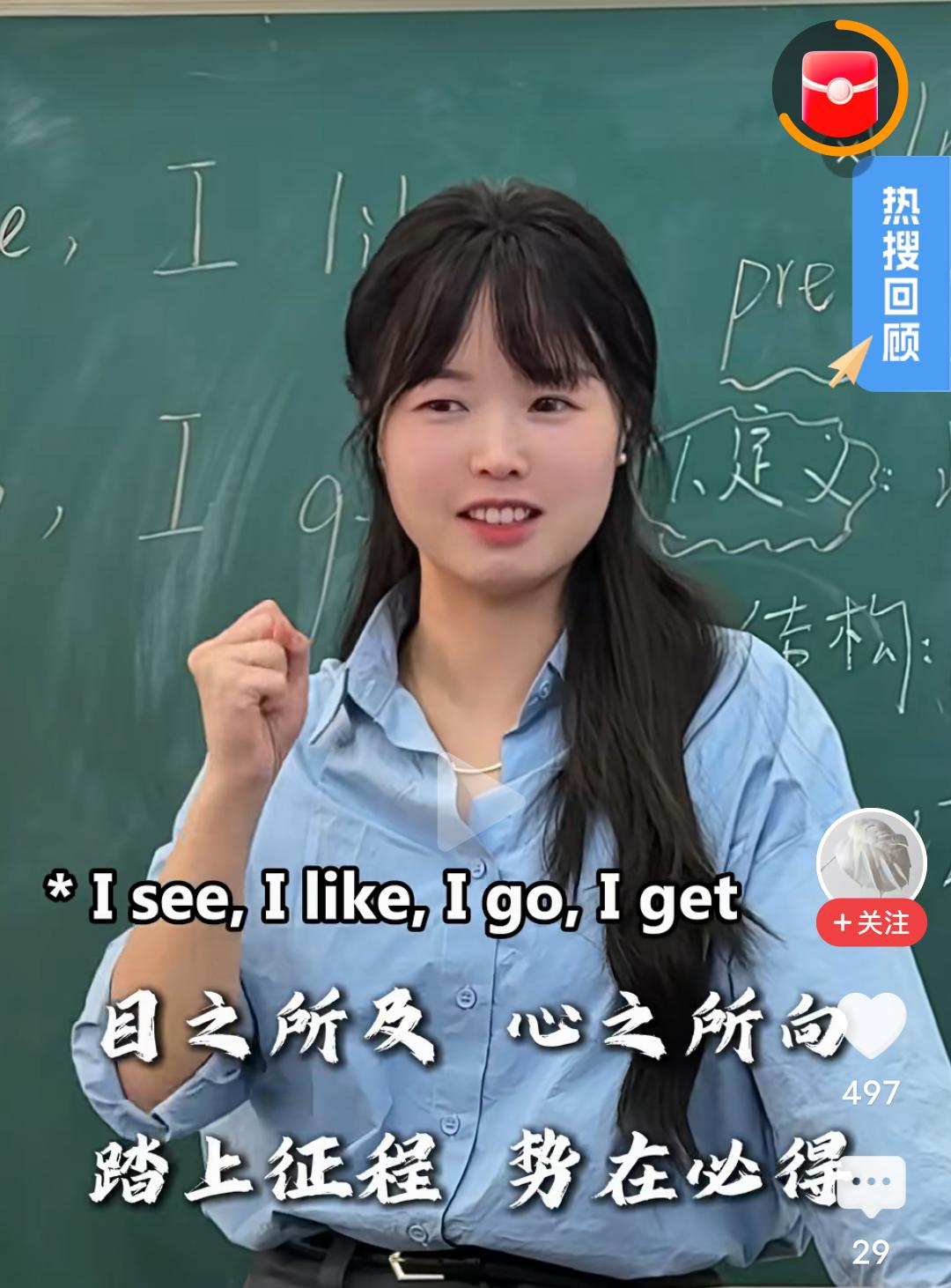 再一次被惊艳到!又刷到了这个老师的视频。 老师说:“下课前有同学问我感到迷茫时怎么办,我很喜欢的一句话送给你们——‘I see, I like, I go, I get’。 问学生怎么翻译,学生回答说“我看到,我喜欢,我去做,我得到。” 老师说很好,它的适用场景很多,更优秀的表达是“目之所及,心之所向,踏上征程,势在必得”,破解迷茫的钥匙从不在别处,而在于自己,加油吧!” 我被这个老师独特的讲解惊讶到了!这是一位英语老师,但她从自己独特的视角,用自己博大的语文知识,做出了属于自己的独到的讲解,让人惊艳不已! 这是一位在英语和文学两个领域底蕴都非常深厚的老师。 有网友开玩笑的说,总感觉你不是个英语老师,是一位会英语的中文老师,当年我要是有这样一位英语老师,也不至于考试总不及格。 有网友赞叹,这个英语老师教课太温暖了,她的笑容好温柔,好像有种魔力,让人忍不住也开心起来! 是啊,世间总有那么一些人,长的并不那么美,但能到达你的心灵!