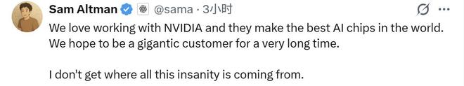 OpenA的CEO奥尔特曼当天也在社交媒体X上发文澄清,“我们喜欢与英伟达合作,他们生产世界上最好的人工智能芯片。我们希望长期成为他们的大客户。我实在搞不懂这些毫无根据的疯狂传言是从哪里来的。”