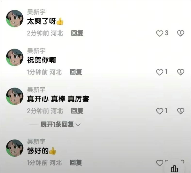 1月27日,10岁的“抗癌小王子”豪豪不幸去世,全网为其悲痛不已。一个叫做“吴新宇”的账号在评论区公开发表“祝贺你”“真开心”等言论: