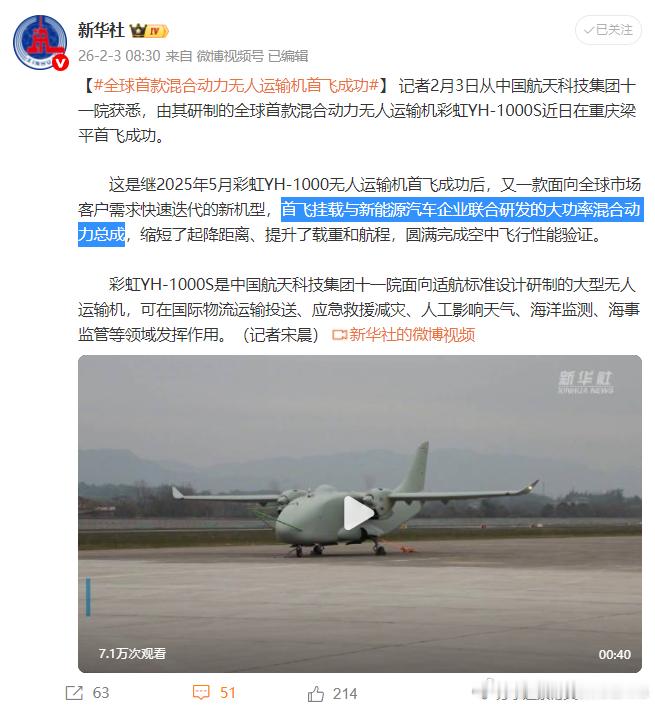 “首飞挂载与新能源汽车企业联合研发的大功率混合动力总成”好奇是哪家,问了一下千问,说是比亚迪,看看后续有没有实锤信息。不过混动系统的优越性已经被无数次证明了,连把可靠性、耐久性、稳定性作为核心中的核心的商用运输机都上了混动,普通消费者就放心吧。纯燃油系统是该加速出清了,混动起码可以做到全系统电气化,电气化后的想象空间就太大了。大v聊车 比亚迪