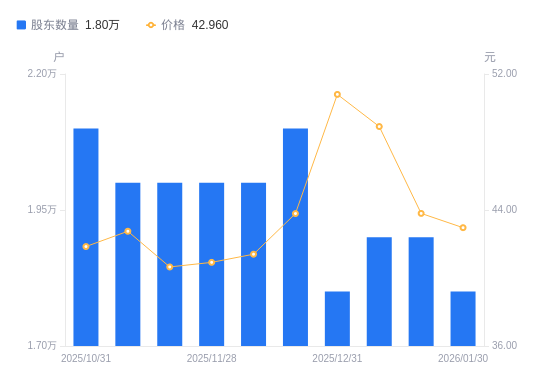 日期A股户数(户)流通A股户均持股数(股)户均持股市值(万元)2026-01-30180007620.2232.742026-01-20190007219.1531.622026-01-09190007219.1535.312025-12-31180007620.2238.712025-12-19210006531.6228.602025-12-10200006858.2028.392025-11-28200006858.2028.062025-11-20200006858.2027.882025-11-10200006858.2029.322025-10-31210006531.6227.33