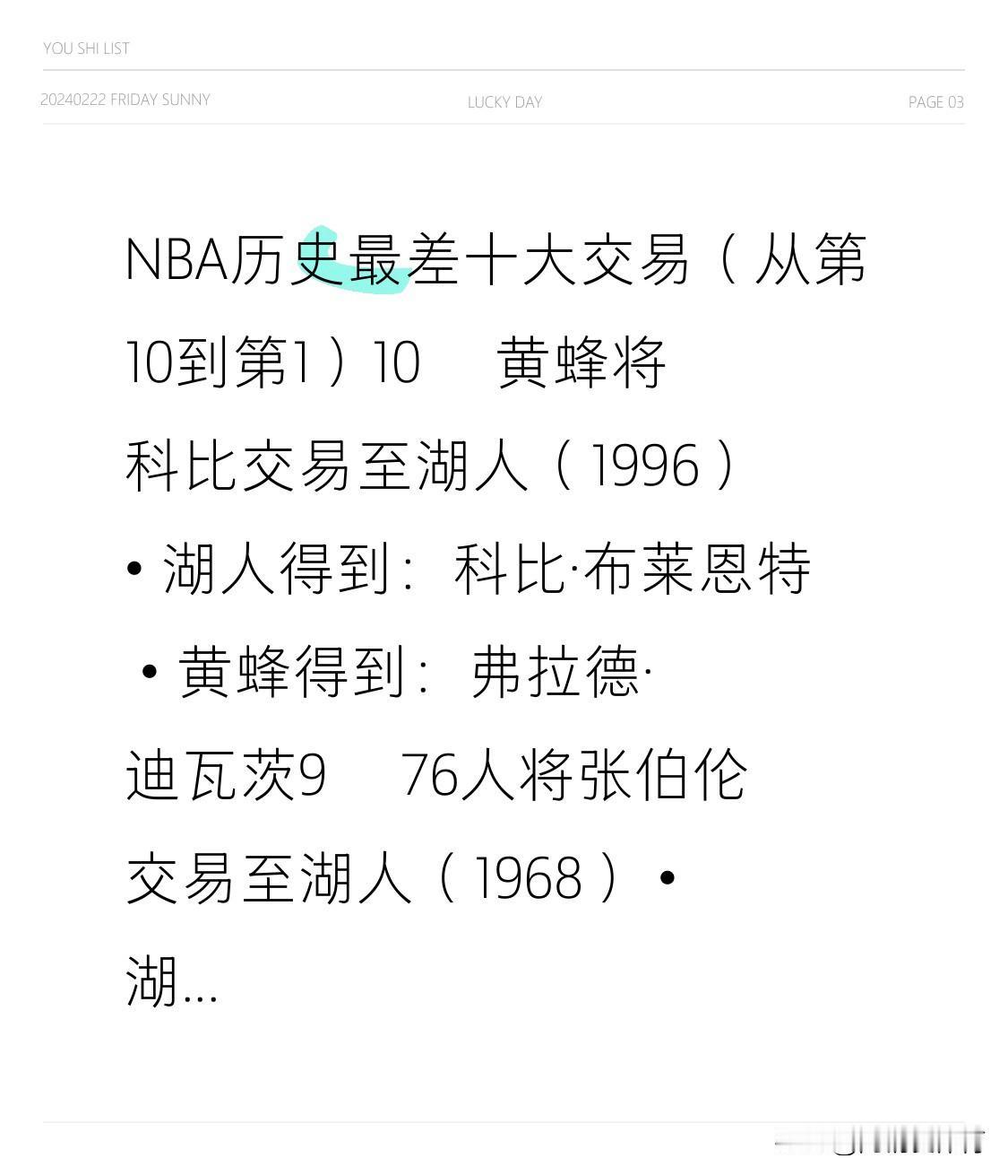 NBA历史最差十大交易(从第10到第1) 10️⃣ 黄蜂将科比交易至湖人(1996) • 湖人得到:科比·布莱恩特 • 黄蜂得到:弗拉德·迪瓦茨 9️⃣ 76人将张伯伦交易至湖人(1968) • 湖人得到:威尔特·张伯伦 • 76人得到:杰里·钱伯斯、阿奇·克拉克、达拉尔·伊姆霍夫 8️⃣ 爵士交易选秀权(后来变成魔术师约翰逊)给湖人(1976) • 湖人得到:首轮签(选中魔术师约翰逊)+ 两个首轮签 + 一个次轮签 • 爵士得到:一个首轮签 + 一个次轮签 7️⃣ 快船将亚历山大送到雷霆(保罗·乔治交易,2019) • 快船得到:保罗·乔治 + 1个首轮签 • 雷霆得到:谢伊·吉尔杰斯-亚历山大 + 达尼洛·加里纳利 + 5个首轮签 + 2个互换权 6️⃣ 老鹰将比尔·拉塞尔交易至凯尔特人(1956) • 凯尔特人得到:比尔·拉塞尔(选秀权) • 老鹰得到:克里夫·哈根、埃德·麦考利 5️⃣ 勇士将张伯伦交易至76人(1965) • 76人得到:威尔特·张伯伦 • 勇士得到:康尼·迪尔金、李·谢弗、保罗·诺依曼 4️⃣ 雄鹿选秀夜把诺维茨基送到独行侠(1998) • 独行侠得到:首轮签(德克·诺维茨基)+ 帕特·加里蒂 • 雄鹿得到:首轮签(罗伯特·特雷勒) 3️⃣ 篮网将朱利叶斯·欧文交易至76人(1976) • 76人得到:朱利叶斯·欧文(J博士) • 篮网得到:现金 2️⃣ 雄鹿将贾巴尔交易至湖人(1975) • 湖人得到:卡里姆·阿卜杜尔-贾巴尔 + 沃尔特·韦斯利 • 雄鹿得到:朱尼尔·布里奇曼、戴夫·梅耶斯、埃尔莫尔·史密斯、布莱恩·温特斯 1️⃣ 独行侠将东契奇交易至湖人(2025) • 湖人得到:卢卡·东契奇、马克西·克莱伯、马基夫·莫里斯 • 独行侠得到:安东尼·戴维斯、马克斯·克里斯蒂、一个首轮签 • 爵士得到:杰伦·胡德-希菲诺、两个次轮签、现金 大家是否认可这交易? 大家是否认可这交易?这些交易在NBA历史长河中都有着深远的影响,每一笔都改变了相关球队的命运走向。 先看黄蜂送出科比这一交易,当时的黄蜂或许没料到科比会成长为篮球史上的传奇巨星。科比为湖人带来了5个总冠军,他的曼巴精神激励着无数球迷。而黄蜂得到的迪瓦茨虽也是不错的球员,但和科比的贡献相比,简直是天壤之别。 76人把张伯伦送到湖人,同样是一笔令人扼腕的交易。张伯伦在湖人继续书写着自己的传奇,帮助球队多次冲击总冠军。反观76人得到的球员,没有一个能达到张伯伦的高度,球队的实力也因此受到不小的影响。 爵士交易掉选中魔术师约翰逊的选秀权,更是让人觉得可惜。魔术师用他的天赋和领导力带领湖人开创了“Showtime”时代,成为了湖人的标志性人物。而爵士换来的选秀权,并没有为球队带来同等的回报。 快船送出亚历山大的交易,在当时快船或许是为了追求当下的成绩。但亚历山大在雷霆迅速成长为球队核心,未来不可限量。快船得到的保罗·乔治虽有实力,但雷霆通过这笔交易积累了大量的选秀权,为球队的重建打下了坚实的基础。 老鹰放走比尔·拉塞尔,让凯尔特人开启了王朝时代。拉塞尔带领凯尔特人夺得多个总冠军,他的防守和领导能力堪称一绝。老鹰得到的球员在历史的长河中显得那么渺小。 勇士将张伯伦交易至76人,再次让张伯伦换了东家。他在76人依旧表现出色,而勇士得到的球员未能弥补张伯伦离开的空缺。 雄鹿在选秀夜把诺维茨基送到独行侠,独行侠得到了一位忠诚且极具实力的球星。诺维茨基为独行侠带来了队史首个总冠军,而雄鹿选中的特雷勒却没能打出预期的表现。 篮网用朱利叶斯·欧文换来现金,这在当时看来就是一笔亏本的买卖。“J博士”在76人成为球队的招牌,带领球队取得了辉煌的成绩。 雄鹿将贾巴尔交易至湖人,湖人得到了一位伟大的中锋,贾巴尔为湖人带来了多个总冠军。而雄鹿得到的球员没有一个能成为球队的核心。 至于独行侠将东契奇交易至湖人这一假设交易,东契奇是当今联盟最具潜力的球星之一,他的离开对独行侠来说无疑是巨大的损失。湖人得到他后,实力将大幅提升,有望冲击总冠军。而独行侠得到的安东尼·戴维斯虽然也是巨星,但他的伤病问题一直是个隐患。 这些交易都各有各的故事和遗憾,它们共同构成了NBA丰富多彩的历史。不知道各位球迷朋友心中,是否还有其他更糟糕的交易呢?不妨在评论区分享出来,一起探讨。