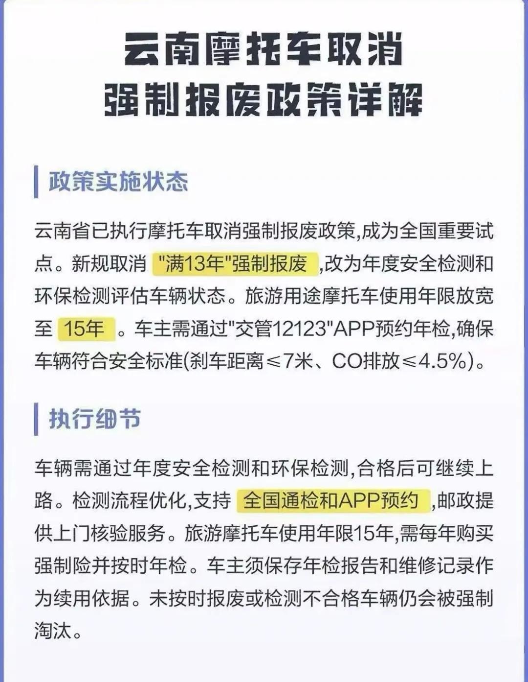 我们距离摩托车解禁还有多少年? 想来,当我问自己这个问题时,心里也是没底的。毕竟“解禁摩”这个话题,年年都有人讨论,却年年都没有确切消息。 或许今年会有所进展。如今,多个省份已传出要开始试点的消息。虽说尚未有确切发文,但大概率已在拟稿阶段。就像云南省,据说会将摩托车使用年限延长至15年,后续是否继续使用将根据摩托车检测状态决定。至于最终能否落实,还需耐心等待。 湖北枝江市已先行一步。在枝江区域,摩托车即便过了13年报废期,只要能通过车检,便可在枝江市范围内继续使用。虽说有一定限制,但也开创了全新管理办法。我特意打电话询问此事,虽未得到明确回复,但大概率是可行的。 至于全国大部分区域,估计只能等区域发文确定,或者等更高级别的发文。没办法,现阶段我们只能耐心等待。