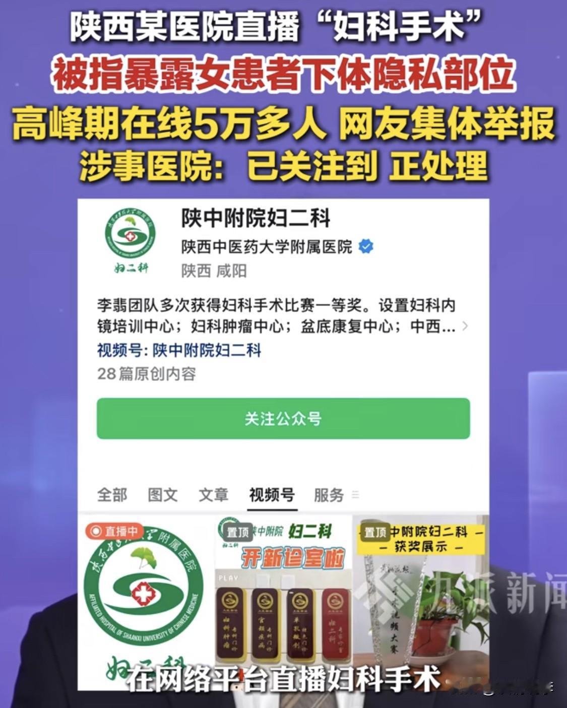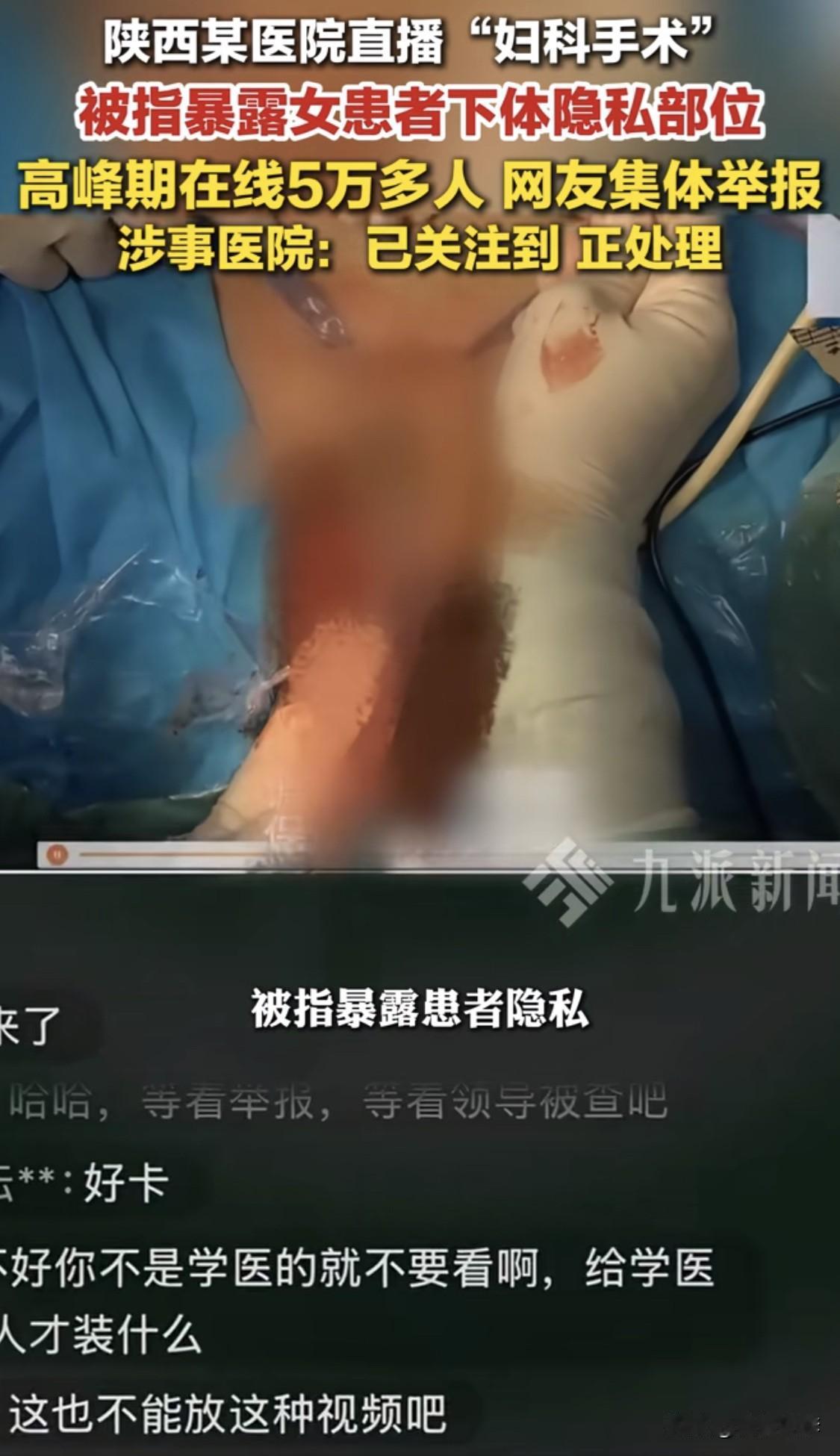 这是真没有底线了!缺德 陕西中医药大学附属医院妇二科的缺德操作,令人看傻了眼!2月2日,该医院妇二科在给一位女性患者做手术的时候,竟然开启直播,在网络平台直播了一场“妇科手术”,画面中赫然出现患者下体隐私部位。 令人难以置信的是,该场直播高峰期在线人数超过了5万人,也就是说,高峰期有5万多网友集体观看了这场直播,这位患者的隐私部位,通过直播暴露在几万人面前……还有不少网友在评论区发布低俗言论…… 这究竟是文明社会的进步,还是文明社会的倒退? 一些网友发现不对劲之后,集中举报,平台才中断了直播。 现在想问一个问题,该医院的妇二科在直播女性妇科手术的时候,是否经过了该患者的同意?患者是否知情?是谁给医院的权利,将女性患者的隐私部位进行网络直播? 目前该医院对此事件的回应是,已经关注到此事,正在处理。 说得轻描淡写的,如果是医院领导的女性亲属做手术,会进行网络直播吗?把普通患者当什么了?这家医院太癫狂了吧?还懂不懂什么是医德?为什么连最基本的底线都没有?希望严查!