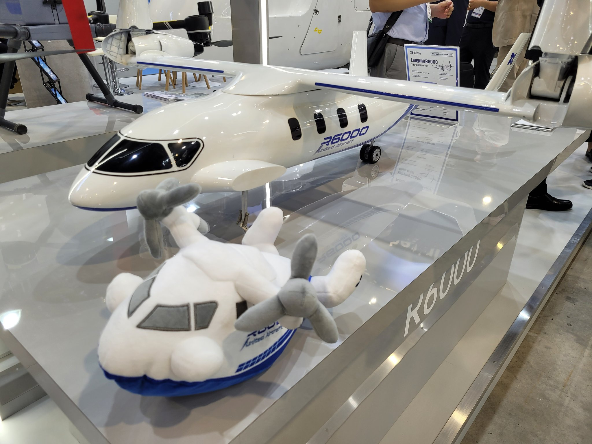 2026新加坡航展 上中国联合飞机公司展出的镧影R6000有人驾驶版倾转旋翼机模型和玩偶,镧影R6000号称是全球首款6吨级倾转旋翼飞行器,其无人版本已经于2025年12月28日在四川什邡成功首飞,圆满完成起降、爬升、悬停、近地面机动等试飞科目。