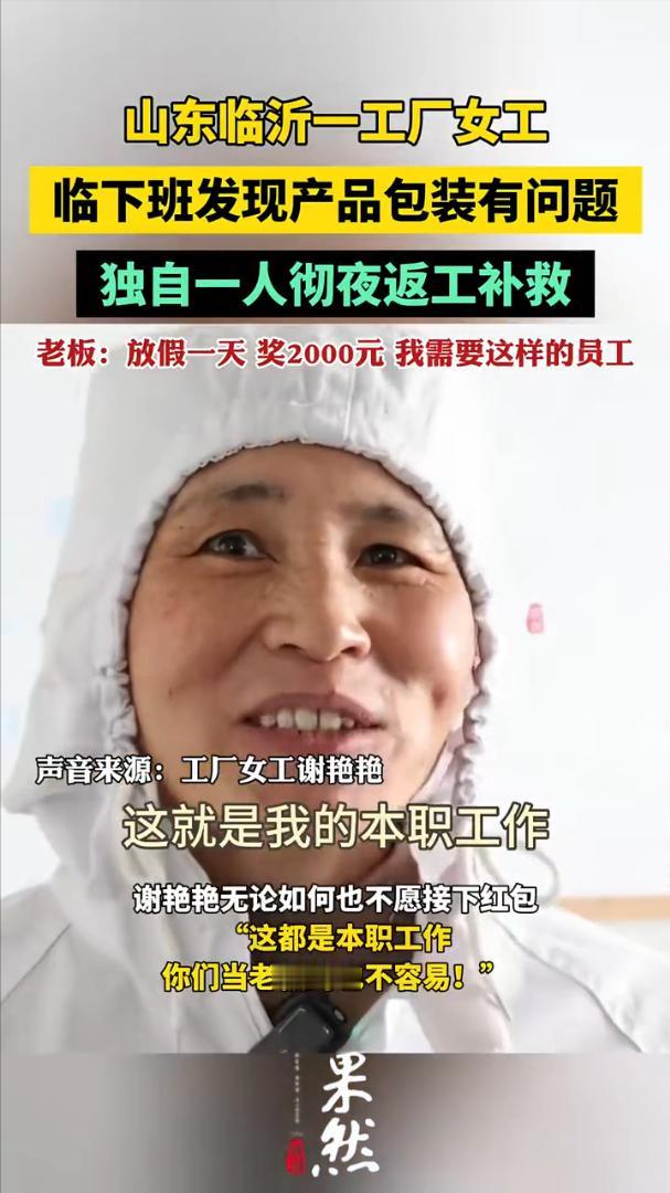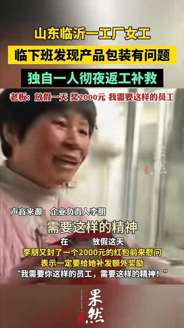 山东临沂,流水线女员工临下班发现产品包装有问题,晚上独自一人返回流水线彻夜返工补救。女员工:这就是我的本职工作,产品质量有问题这样肯定是不能发货的,你们当老板的也不容易。 食品工厂女工谢艳艳在2月1号生产过程中临下班时发现今天生产的食品有问题,员工称的质量有问题包装里的食品分量不够。 可是明天上午这批产品就要发货,如果客户收到这样的产品肯定会影响公司的声誉。谢春艳急在心里,吃过晚饭后,她独自一人返回生产车间,对这批产品返工重新称重包装。 她一个人足足干了一夜直到清晨6点才把这批产品返工完毕,谢艳艳才拖着疲惫的身体返回宿舍。 第二天工人们上班才得知谢艳艳加了一夜的班返工,把不合格的产品重新加工包装。有人把这个情况报告给了公司老板,老板也是对谢艳艳的行动感动不已,让财务给她发了200元的加班费,自己又给她准备了一个2000元的红包。 而谢艳艳却拒绝了老板的红包,她说,这是自己的本职工作,老板也不容易,这是自己应该做的,只有企业好了,自己才会有饭吃。 老板把谢艳艳的这个行为发到了网上,也引发了网友的热议,有的网友说,我也是小老板,这样的员工绝对当成自己的事情来做了,点赞! 也有的说,这位女員工对公司忠心耿耿,很有职业操守,自觉加班补救公司产品,這种員工很难得,给她点赞了! 还有的说,好的员工遇到好的老板,这样的老板才能发财,这样的员工才有干劲,才有积极性! 员工能够以企为家,主动加班返工保证产品质量。老板正面激励不让员工白付出,员工有责任感,老板有格局这才是企业应该有的精神,这样的企业才能有发展和未来。