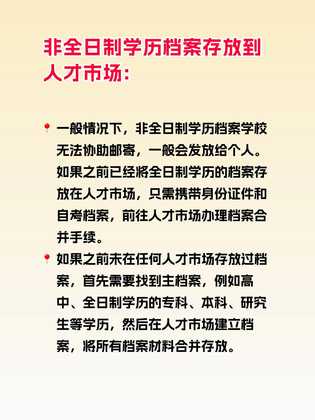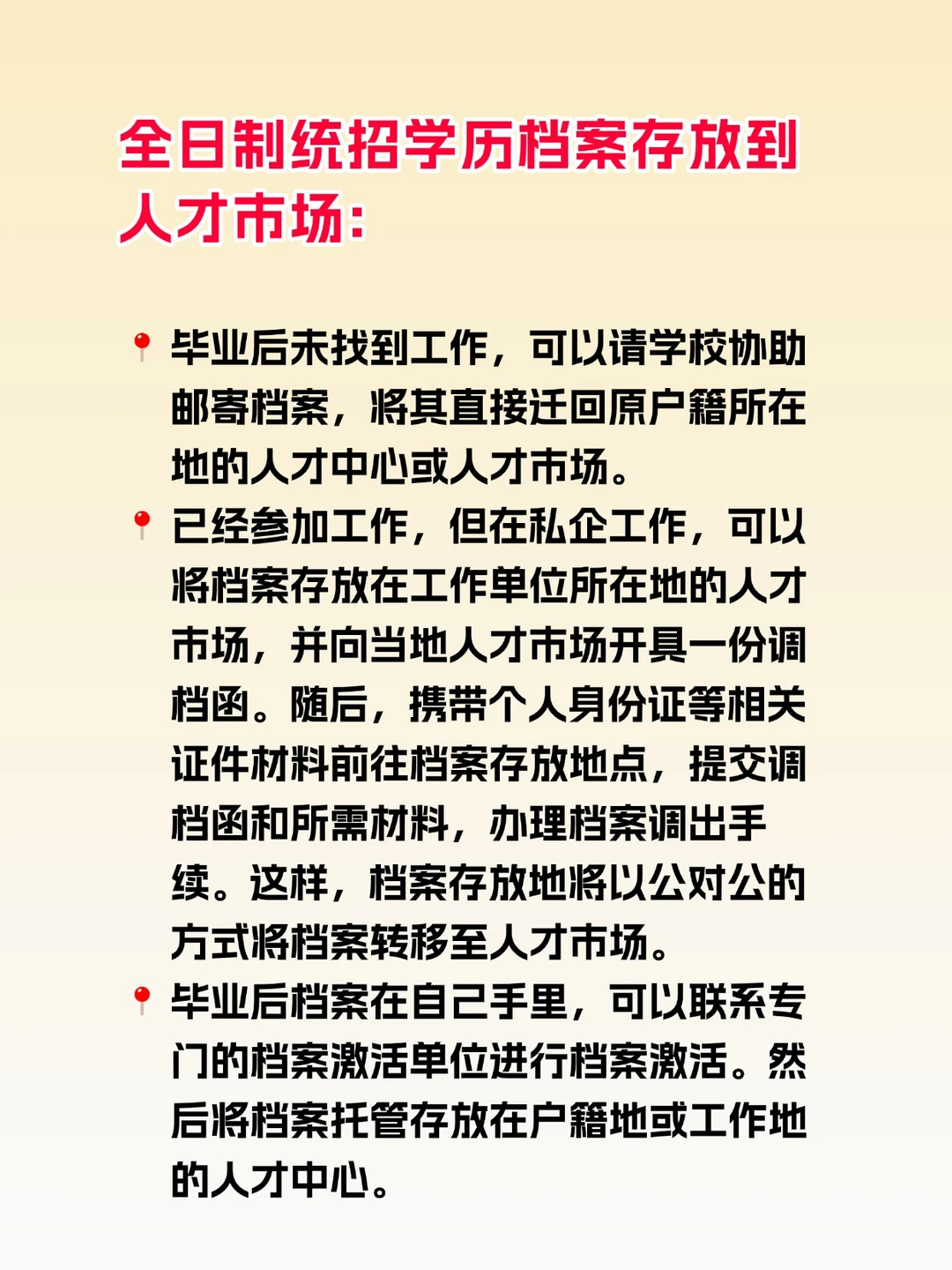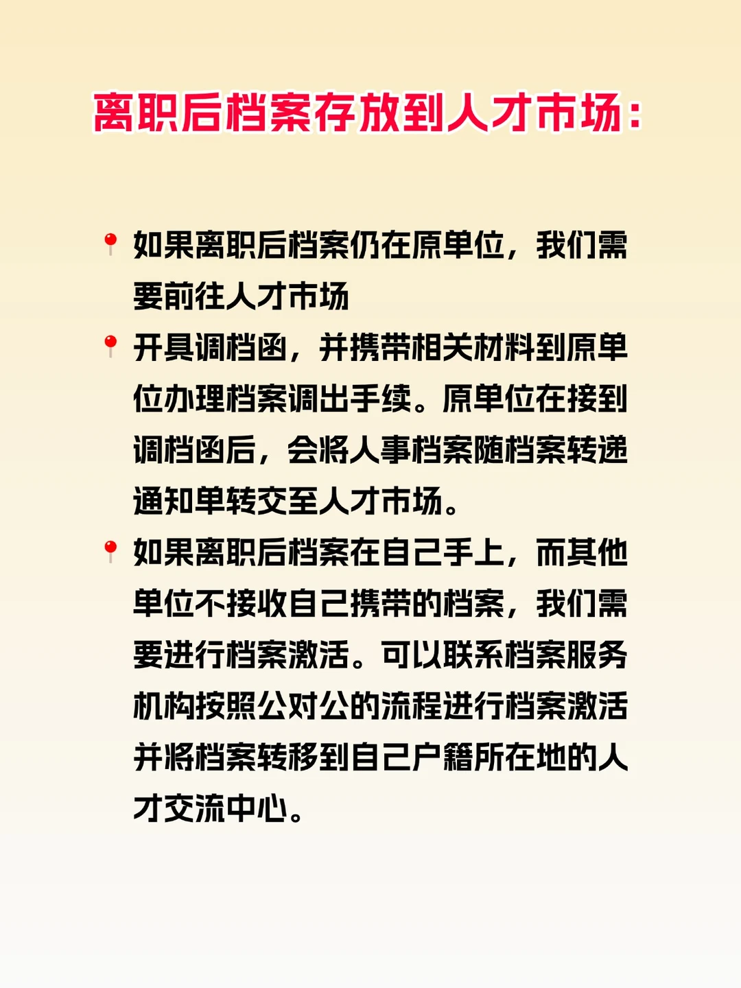档案在自己手里怎么存到人才市场?[萌萌哒R]全日制统招学历档案存放到人才市场: [彩虹R]毕业后未找到工作,可以请学校协助邮寄档案,将其直接迁回原户籍所在地的人才中心或人才市场。 [彩虹R]已经参加工作,但在私企工作,可以将档案存放在工作单位所在地的人才市场,并向当地人才市场开具一份调档函。随后,携带个人身份证等相关证件材料前往档案存放地点,提交调档函和所需材料,办理档案调出手续。这样,档案存放地将以公对公的方式将档案转移至人才市场。 [彩虹R]毕业后档案在自己手里,可以联系专门的档案激活单位进行档案激活。然后将档案托管存放在户籍地或工作地的人才中心。 [害羞R]非全日制学历档案存放到人才市场: 一般情况下,非全日制学历档案学校无法协助邮寄,一般会发放给个人。如果之前已经将全日制学历的档案存放在人才市场,只需携带身份证件和自考档案,前往人才市场办理档案合并手续。 [举手R]如果之前未在任何人才市场存放过档案,首先需要找到主档案,例如高中、全日制学历的专科、本科、研究生等学历,然后在人才市场建立档案,将所有档案材料合并存放。 [斜眼R]离职后档案存放到人才市场: [彩虹R]如果离职后档案仍在原单位,我们需要前往人才市场! [彩虹R]开具调档函,并携带相关材料到原单位办理档案调出手续。原单位在接到调档函后,会将人事档案随档案转递通知单转交至人才市场。 [彩虹R]如果离职后档案在自己手上,而其他单位不接收自己携带的档案,我们需要进行档案激活。可以联系档案服务机构按照公对公的流程进行档案激活并将档案转移到自己户籍所在地的人才交流中心。