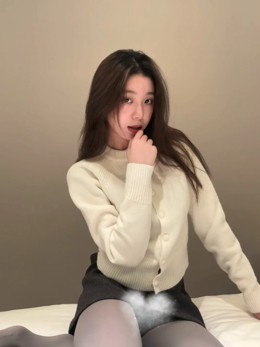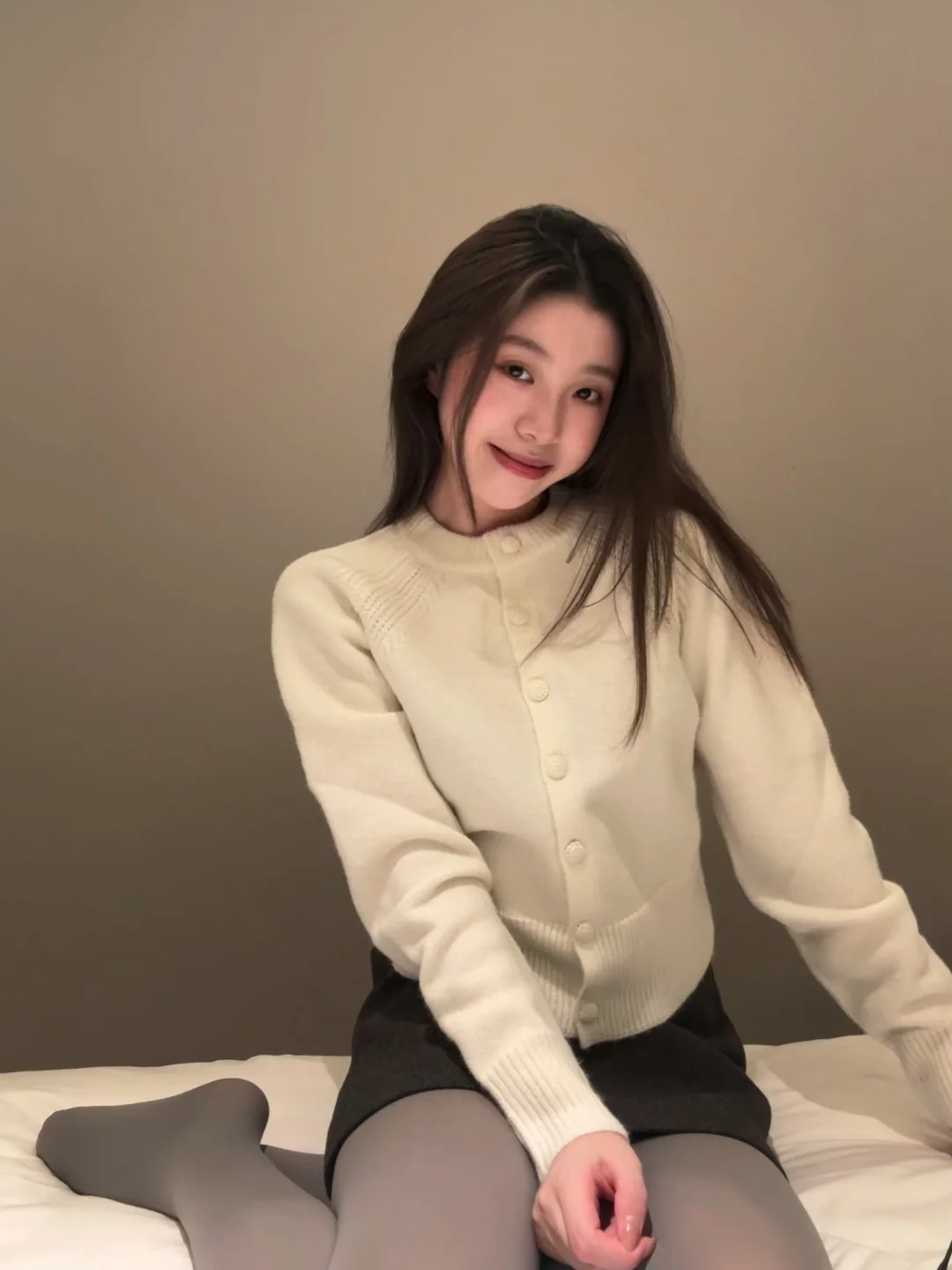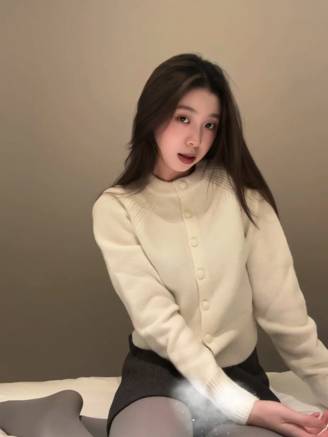奶fufu的米白针织衫真的自带柔光滤镜, 配深灰短裙+灰丝,把温柔和小性感焊在身上了!💗