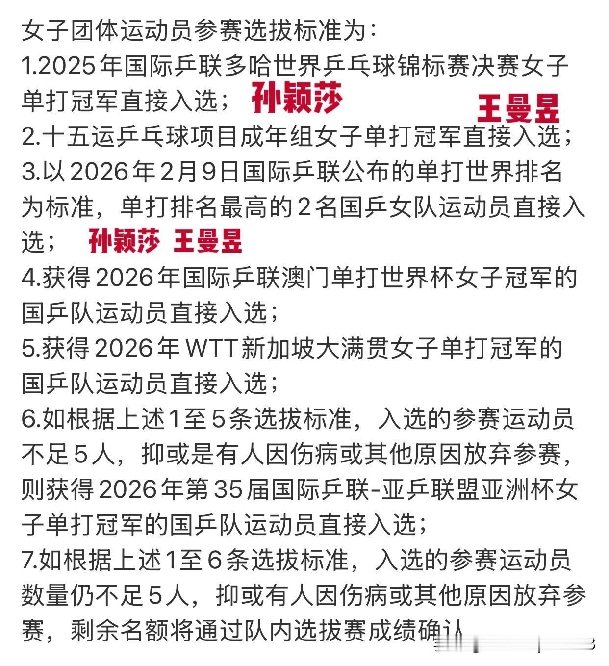 孙颖莎,王曼昱,王楚钦,樊振东,林诗栋获得伦敦世乒赛团体赛参赛资格! 中国乒协最新公布伦敦世乒赛团体赛运动员选拔标准, 女单,孙颖莎,王曼昱确认可以参赛, 男单,王楚钦,樊振东,林诗栋获得参赛资格, 一共5人参赛,女单的三个名额,男单的两个名额,需要参考世界杯和新加坡大满贯的比赛结果来确定, 还有一个就是教练组的组合评定。