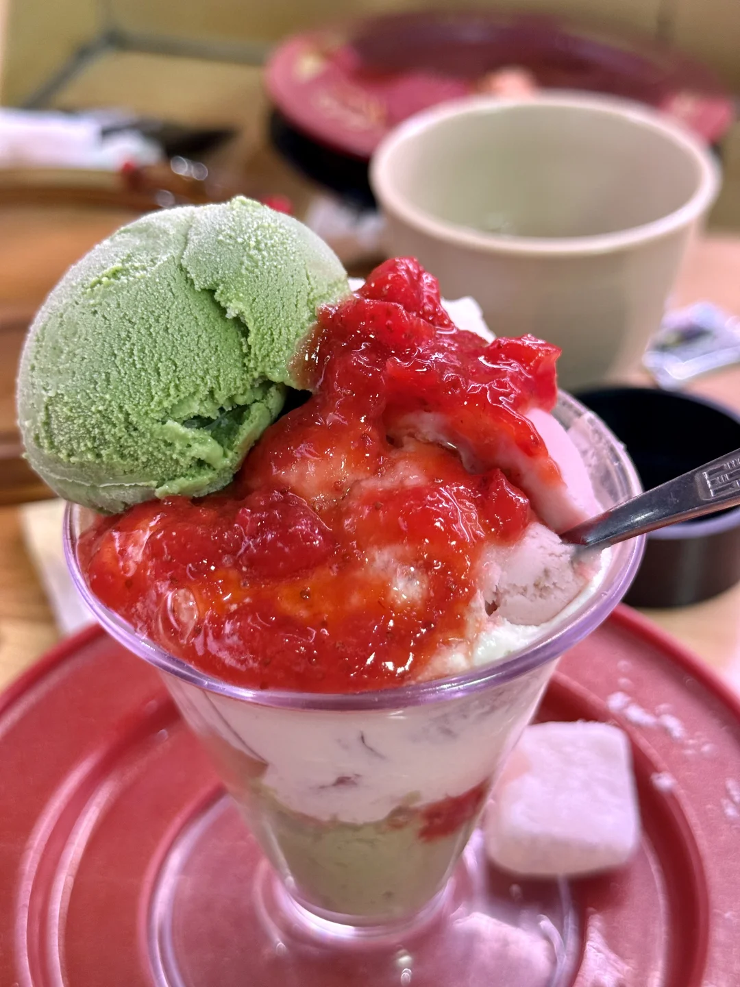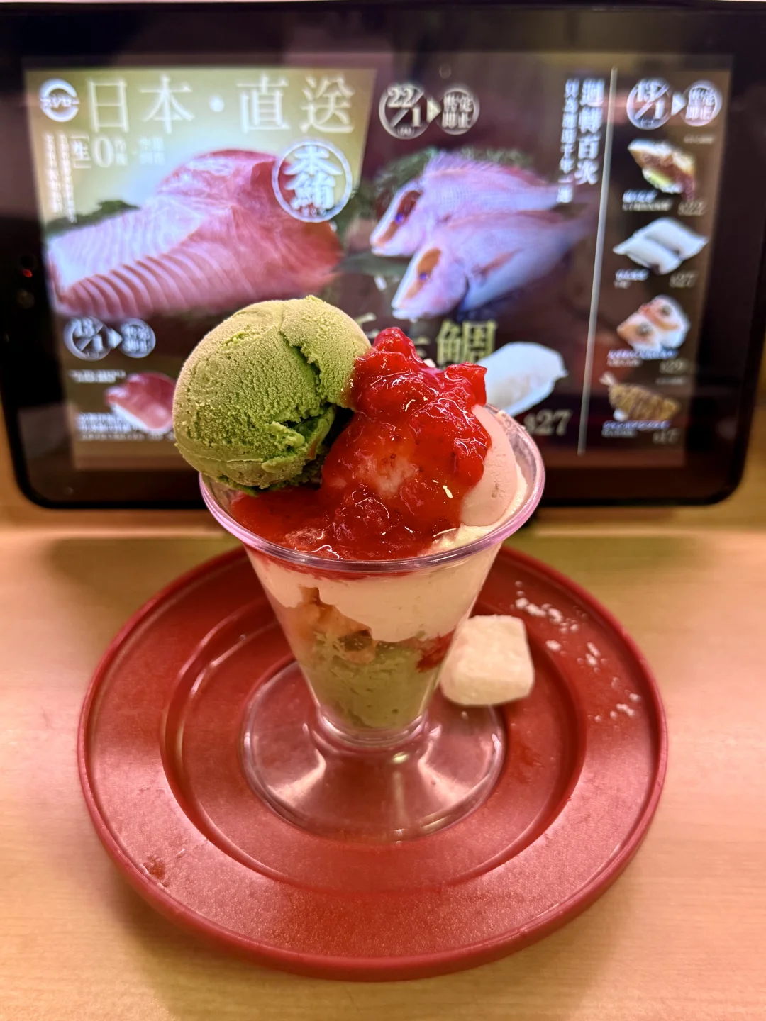 当心就跟我一样… 刚刚在寿司郎不小心手机从衣服口袋里飞出来 直接飞到桌子上,我去接的时候 手指误触了点餐大屏,正好点进了甜品栏 浴室下单了一杯草莓抹茶芭菲🍓 等缓过来想退款已经做好传送过来了 哎呀真是奇幻的一个瞬间啊.. 发出来就是想跟大家说以后都小心点 这次没办法了只能吃掉了…..