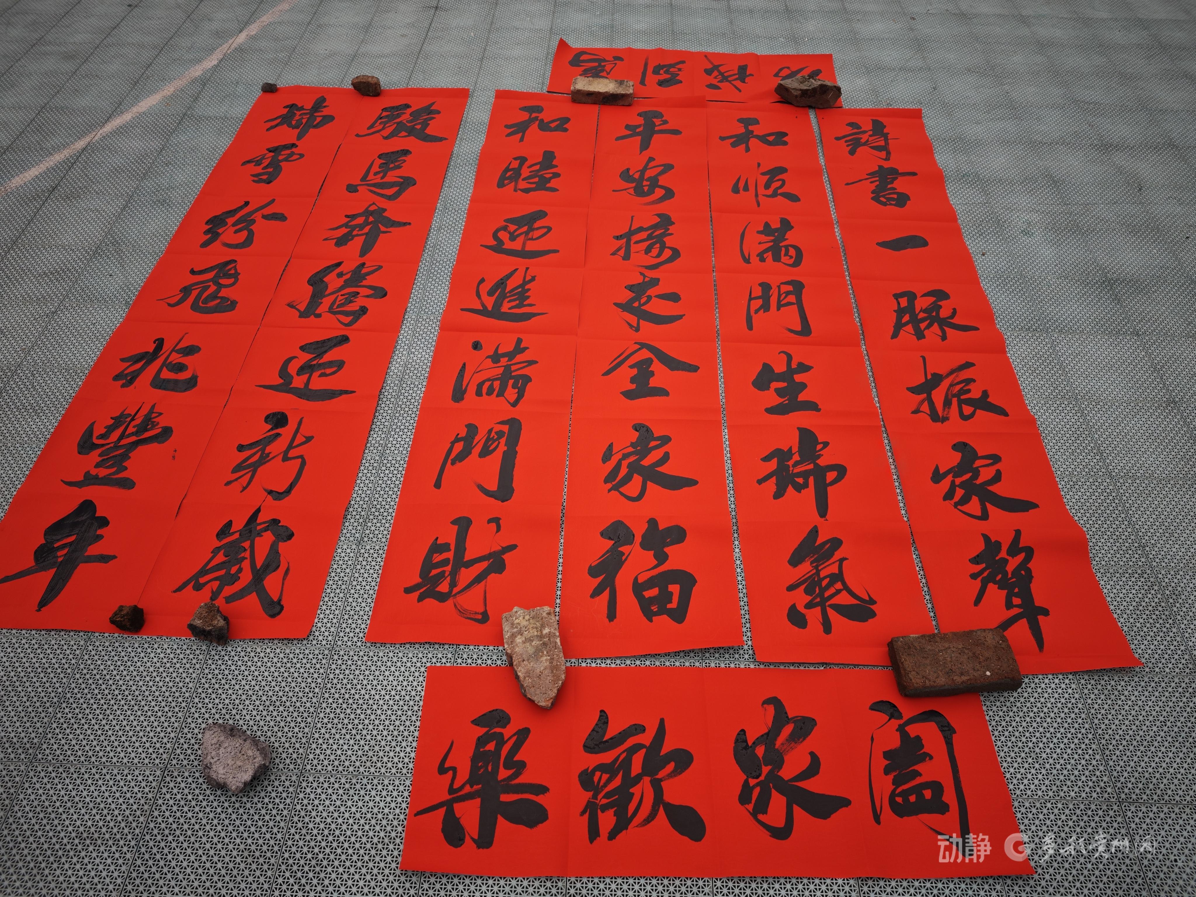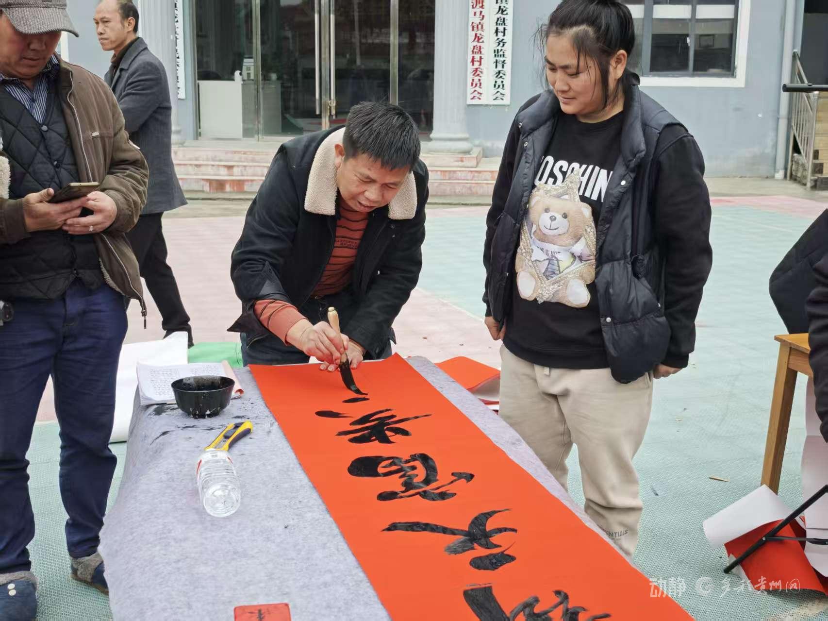 春节将至,年味渐浓。2月3日(农历腊月十六),黔东南苗族侗族自治州天柱县渡马镇龙盘村的书法爱好者们自发前往龙盘村委会门口,开展为村民义务写春联送祝福的活动。活动现场气氛热烈,龙盘村的书法爱好者们挥毫泼墨,在喜庆的红纸上书写出一副副饱含祝福的春联。