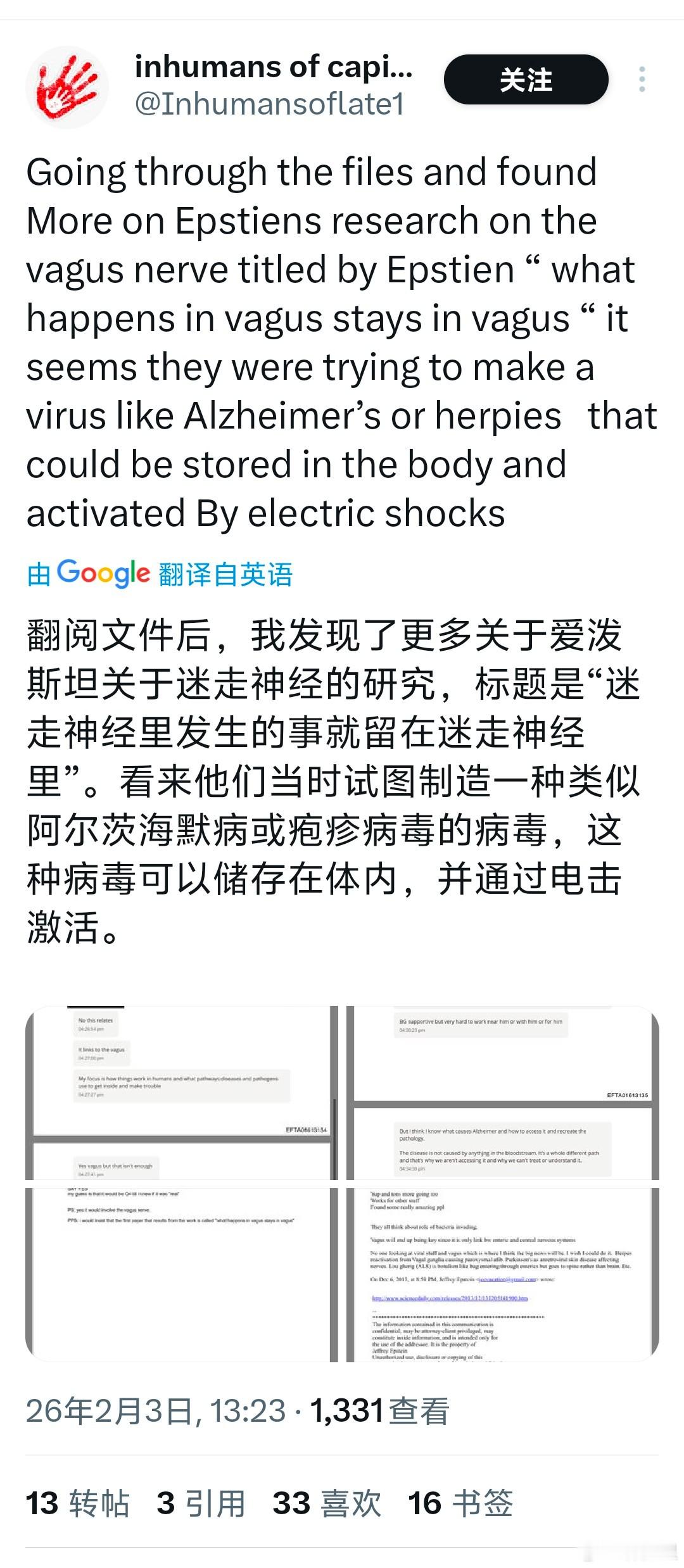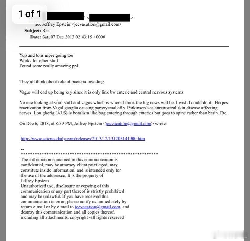 爱泼斯坦档案一些有关生物医学的内容。欧美网友看了后认为,爱泼斯坦他们研究一种能传