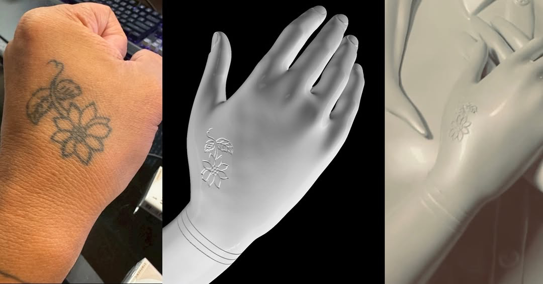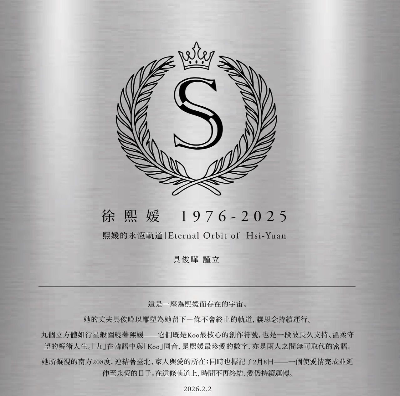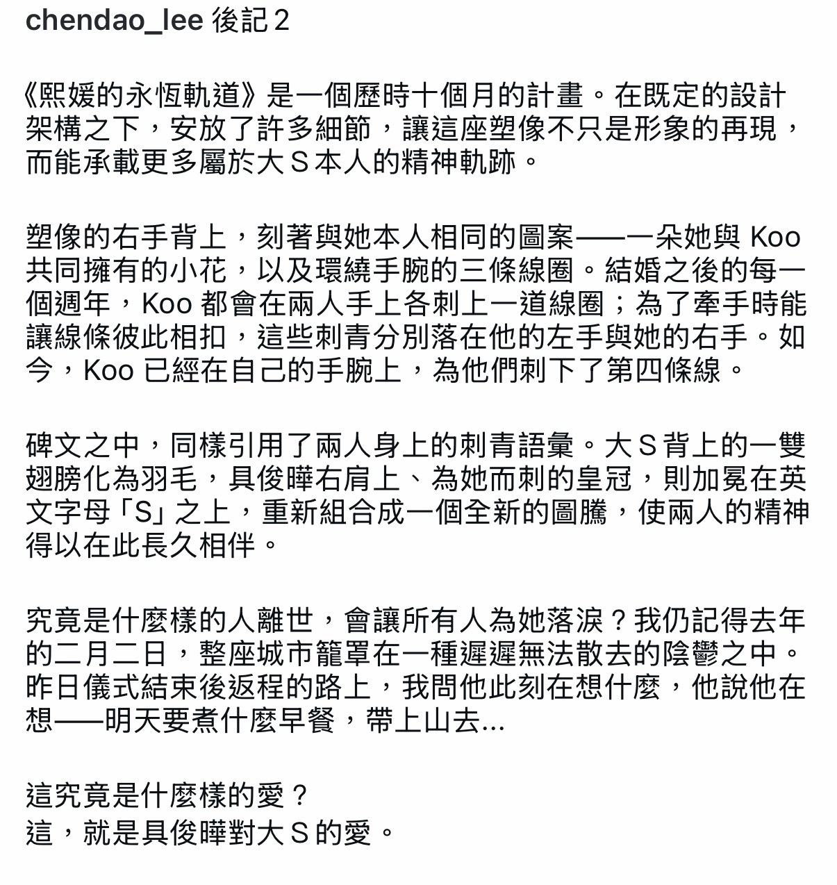 「塑像的右手背上,刻着与她本人相同的图案——一朵她与 Koo 共同拥有的小花,以及环绕手腕的三条线圈。结婚之后的每一个週年,Koo 都会在两人手上各刺上一道线圈;为了牵手时能让线条彼此相扣,这些刺青分别落在他的左手与她的右手。如今,Koo 已经在自己的手腕上,为他们刺下了第四条线。」