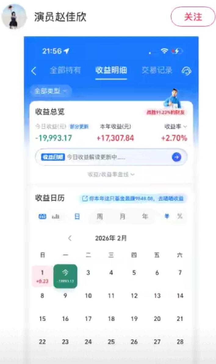 笑不活了!演员赵佳欣基金投资上演“大起大落”!前脚刚晒收益月赚5万,被朋友夸“被