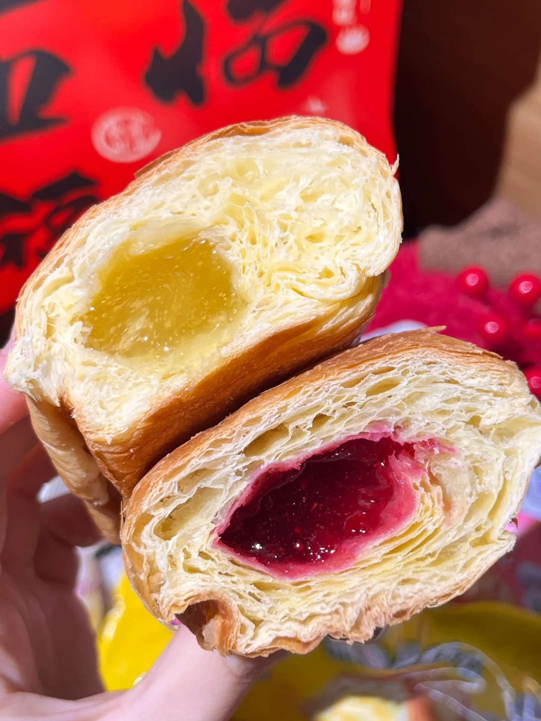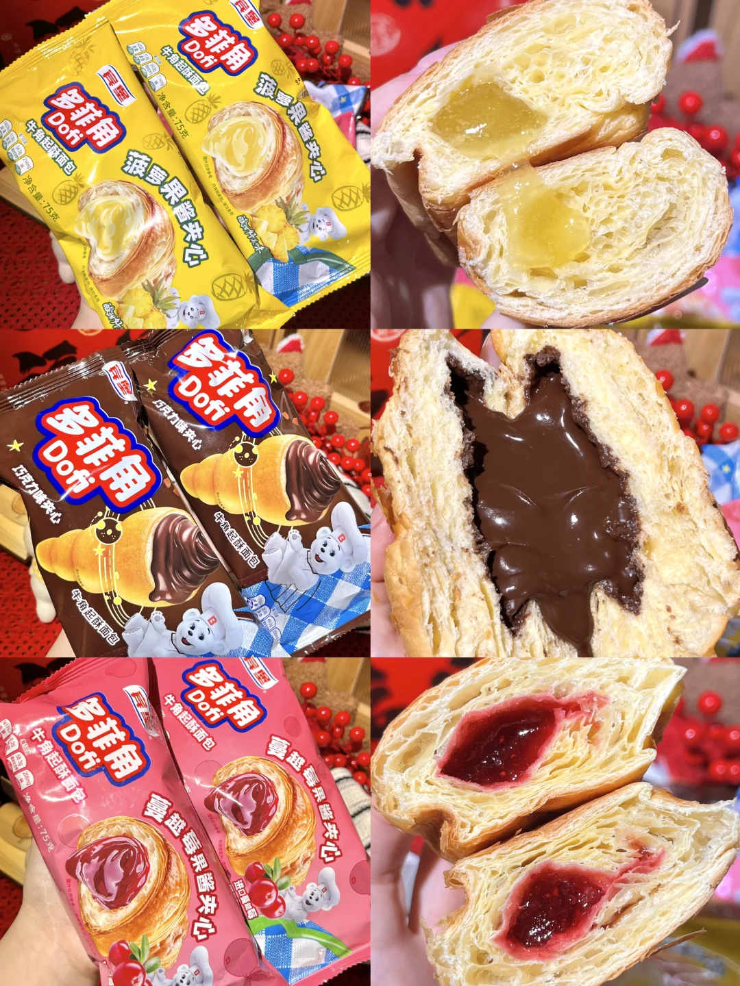 三种口味闭眼冲!表皮酥香松软,果酱添加量还高达30%,料足够味!巧克力味加热爆浆超丝滑,蔓越莓款用的是加拿大进口果料,酸甜清爽解腻,菠萝款精选湛江徐闻菠萝,能吃到真实果粒,果香超足~