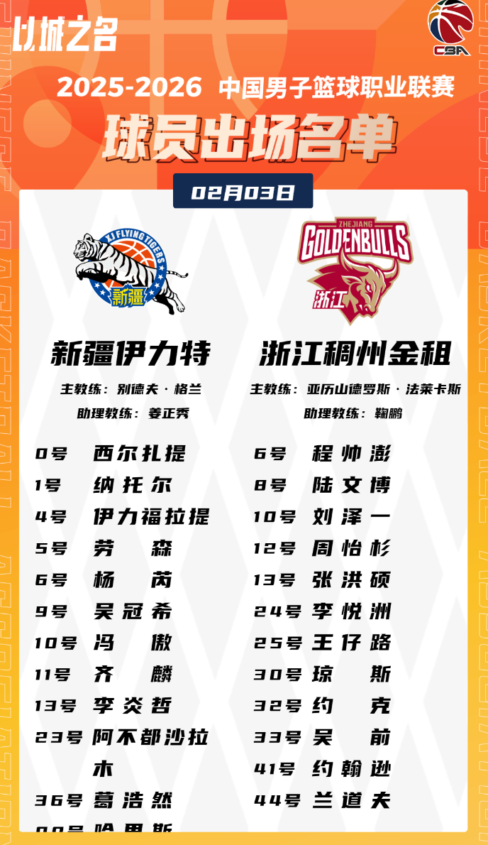 虎扑02月03日讯今晚CBA常规赛,新疆对阵浙江的大名单已经公布。